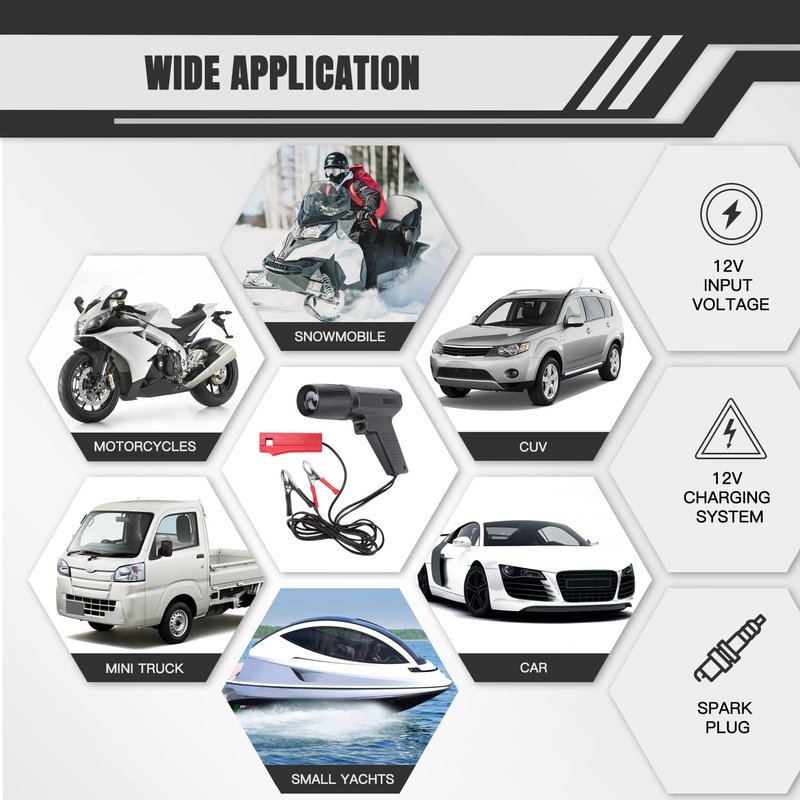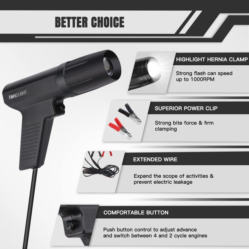 - [Wide Compatibility] This engine timing light is suitable for automobiles, motorcycles, boats and all two-stroke or four-stroke gasoline engines, easily operate on 12V ignition systems.