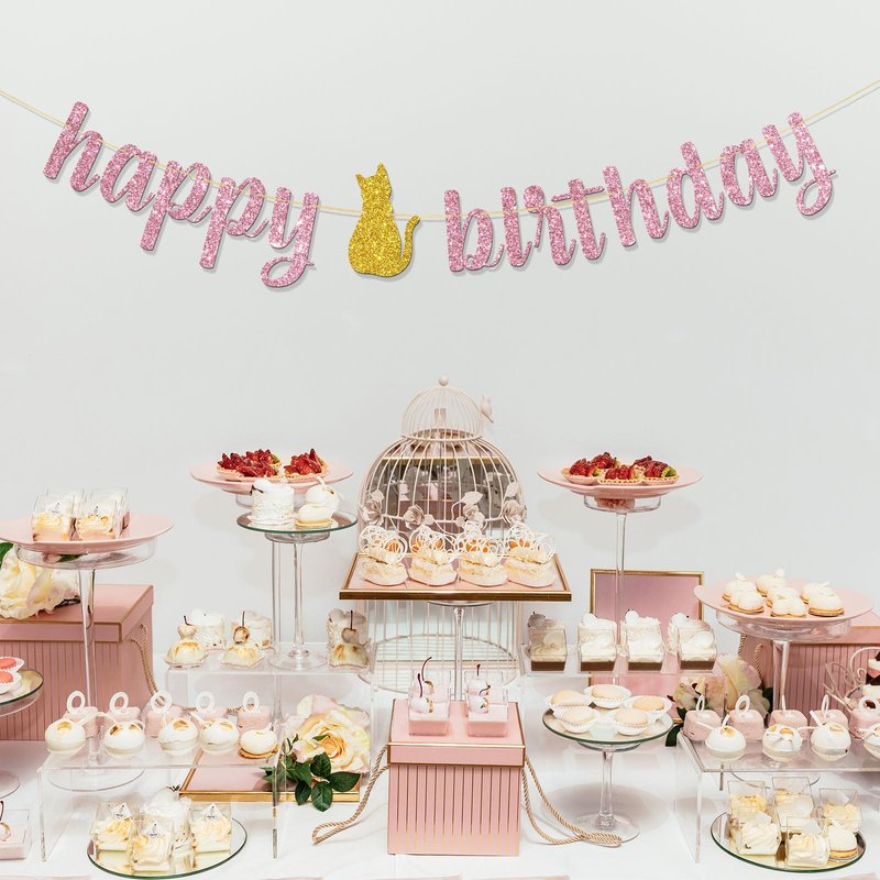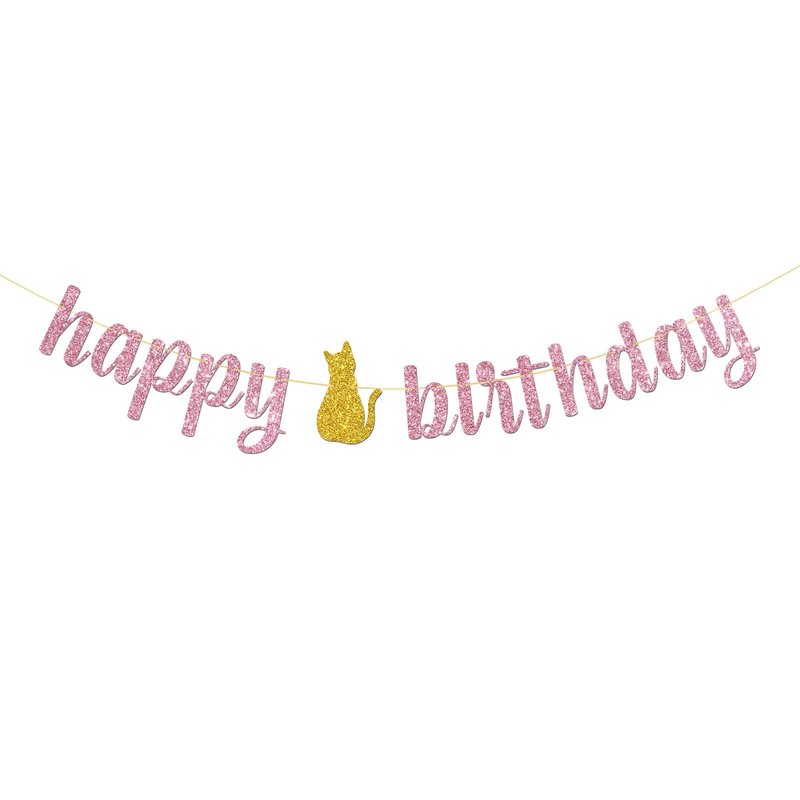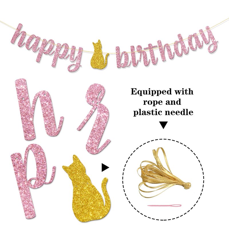 RoadSea Cat Happy Birthday Banner - Kitten Girl Kid Birthday Party Garland Supplies - Moew Let's Pawty Banner - Pet Cat Birthday Party Decorations - Gold Glitter
