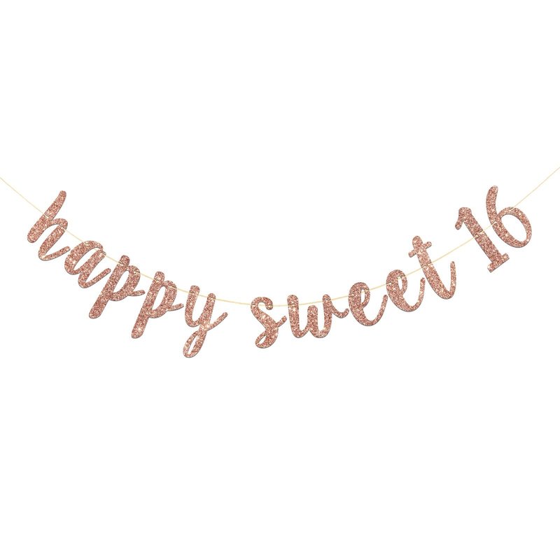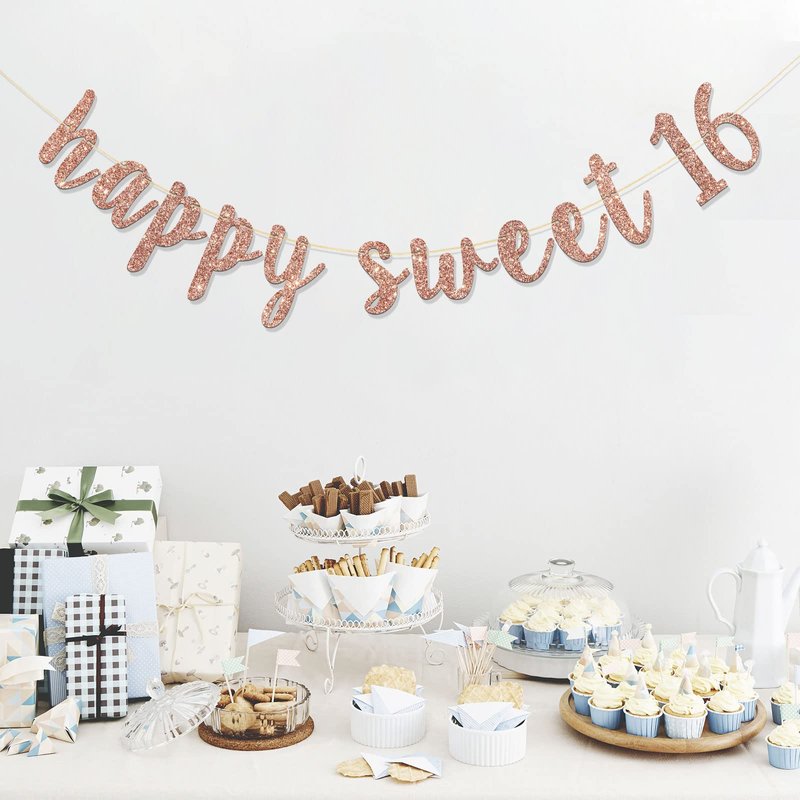 RoadSea Happy Sweet 16 Banner - Girl 16th Birthday Party Garland Supplies- Happy 16th Birthday Party Decorations - Rose Gold Glitter