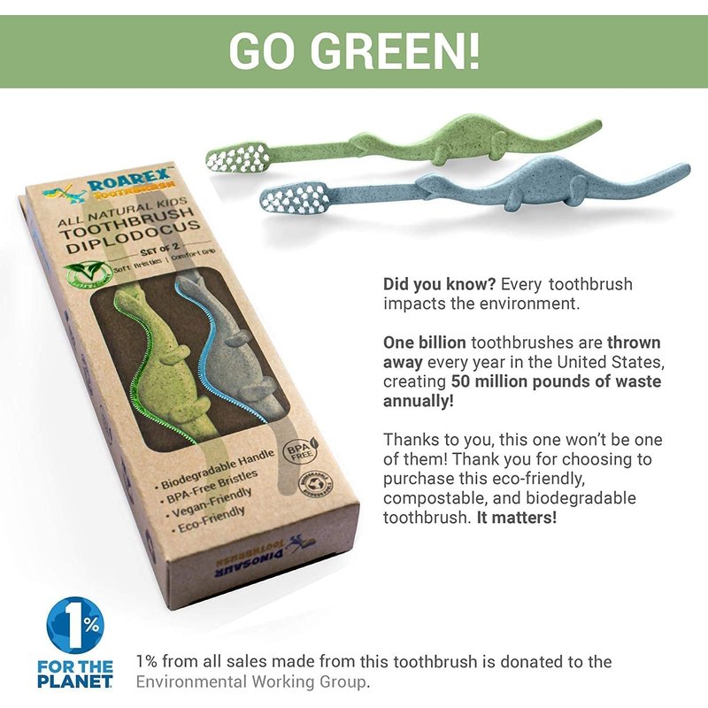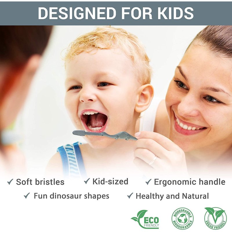 - 100% Natural Choice Toothbrush: Made from all-natural organic plant material with a fully biodegradable and compostable handle, these toothbrushes are a true eco-friendly and vegan-friendly product that teaches our little ones about the importance of sustainability and protecting our environment.