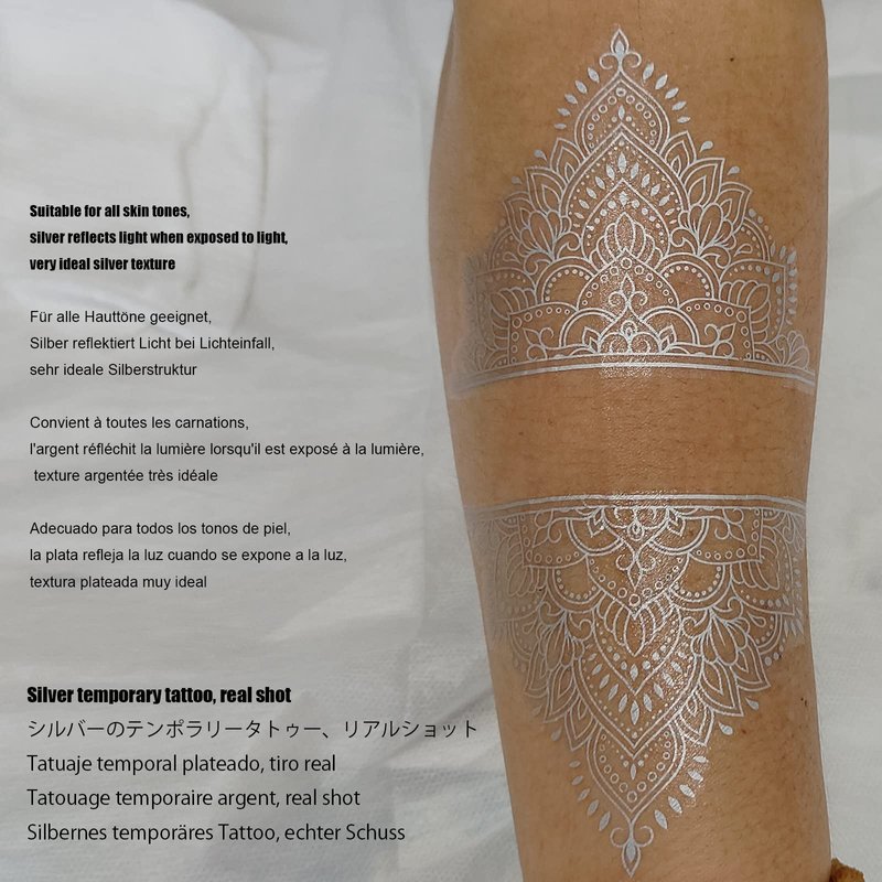 These are silver temporary tattoos with good texture, reflecting in different light, luxurious and low-key beauty, clear and beautiful patterns, applicable to all skin colors, and temporary tattoos last about a week.