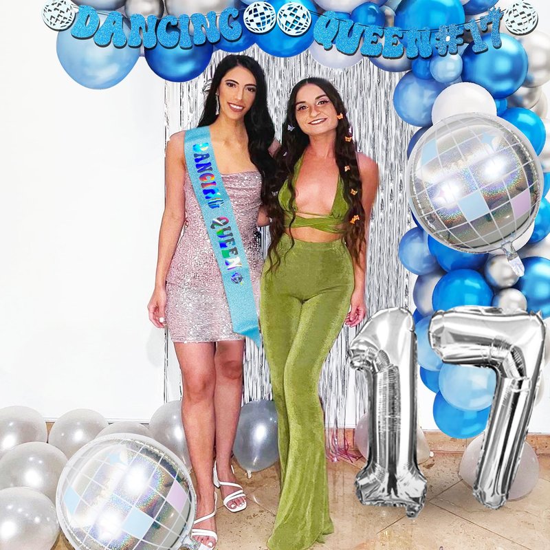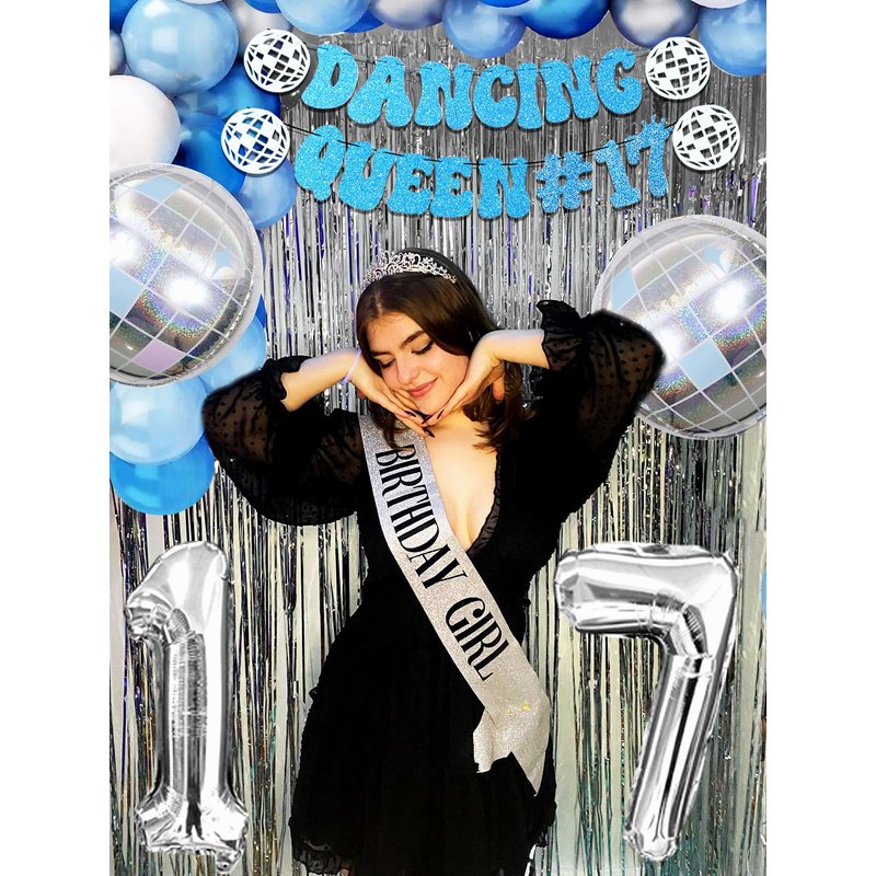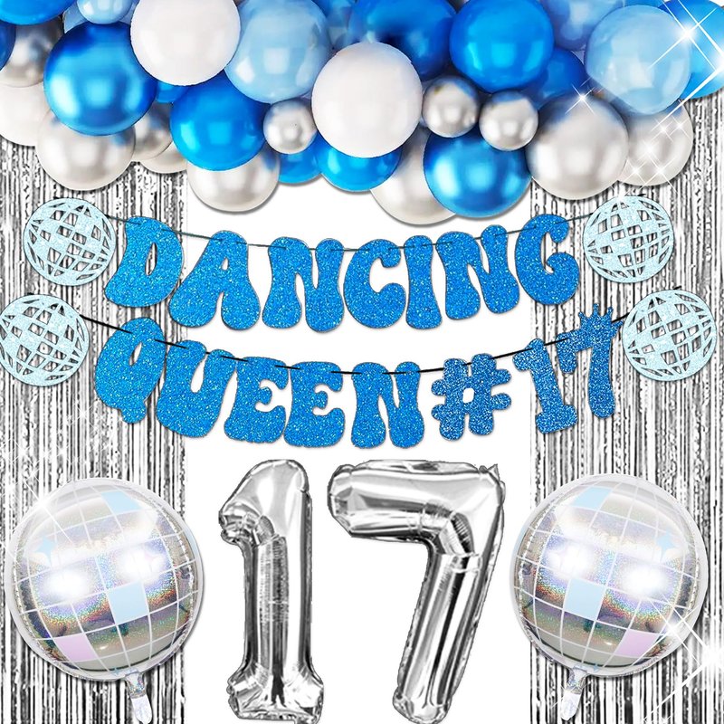 - Dancing Queen 17 birthday decoration:You will receive 1 x ‘Dancing Queen 17’ banner, 2 x disco balloons, 1 x silver curtains, 20X latex balloons (5 Xdark blue, 5 Xlight blue, 5X white, 5 Xsilver)
