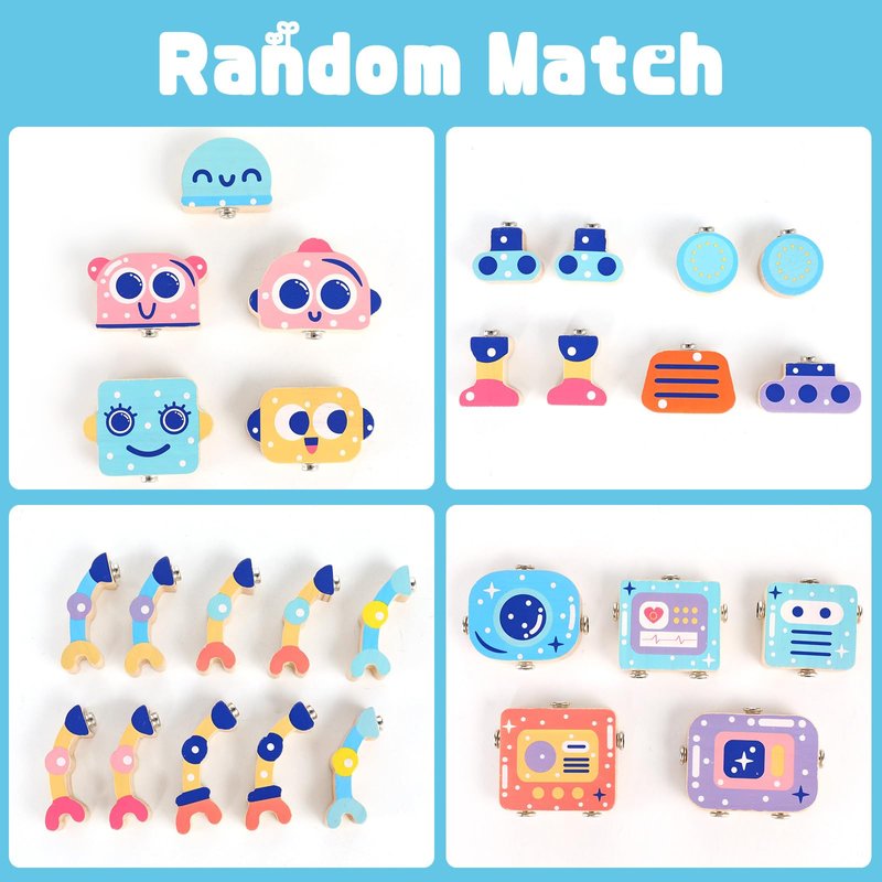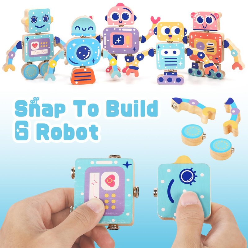 - Build Four Robotic Creatures: You will receive 30 pieces of wooden open-ended robot builders. Kids can use these color-coded snap-together heads, arms, legs, and more to create 4 different robots. They can also use their imagination to mix and match these builders to invent unique robotic creations!