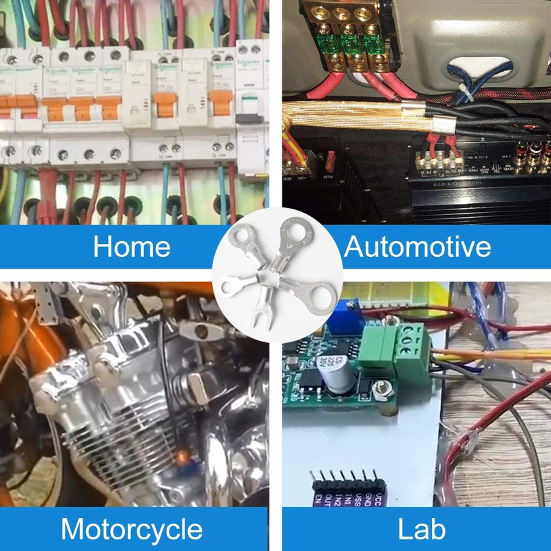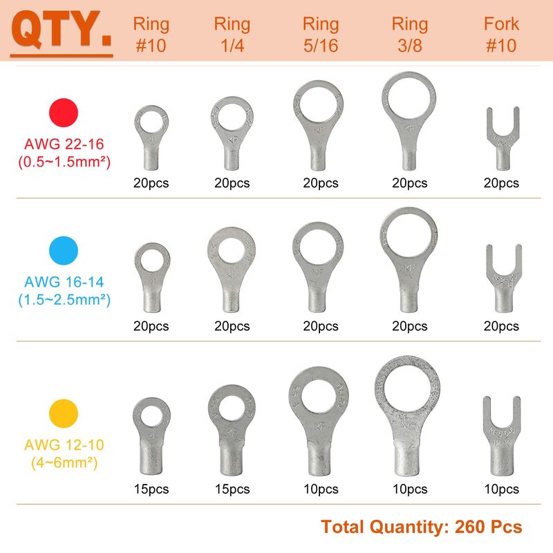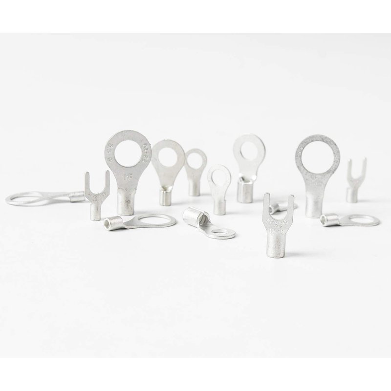 The ring/fork terminals are used to attach wires to studs or posts, and come in a variety of types and sizes. Non-insulated ring terminals can be crimped or soldered and can be easily finished off with heat shrink tubing to insulate and protect the connection. Material: 99.9% pure copper; Finsh: Matte tin plated; Rated temperature: 221°F (105°C); Rated voltage: 600 volts. Package: RNB1.25-5(AWG 22-16 * Ring #10) --- 20pcs; RNB1.25-6(AWG 22-16 * Ring 1/4") --- 20pcs; RNB1.25-8(AWG 22-16 * Ring 5/16") --- 20pcs; RNB1.25-10(AWG 22-16 * Ring 3/8") --- 20pcs; SNB1.25-5(AWG 22-16 * Fork #10) --- 20pcs; RNB2-5(AWG 16-14 * Ring #10) --- 20pcs; RNB2-6(AWG 16-14 * Ring 1/4") --- 20pcs; RNB2-8(AWG 16-14 * Ring 5/16") --- 20pcs; RNB2-10(AWG 16-14 * Ring 3/8") --- 20pcs; SNB2-5(AWG 16-14 * Fork #10) --- 20pcs; RNB5.5-5(AWG 12-10 * Ring #10) --- 15pcs; RNB5.5-6(AWG 12-10 * Ring 1/4") --- 15pcs; RNB5.5-8(AWG 12-10 * Ring 5/16") --- 10pcs; RNB5.5-10(AWG 12-10 * Ring 3/8") --- 10pcs; SNB5.5-5(AWG 12-10 * Fork #10) --- 10pcs;Total: 260pcs.