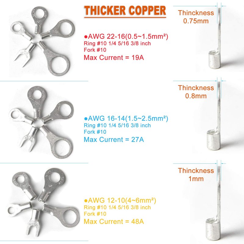 - Thickness: T=0.75mm for AWG 22-16 terminals; T=0.8mm for AWG 16-14 terminals; T=1.0mm for AWG 12-10 terminals;