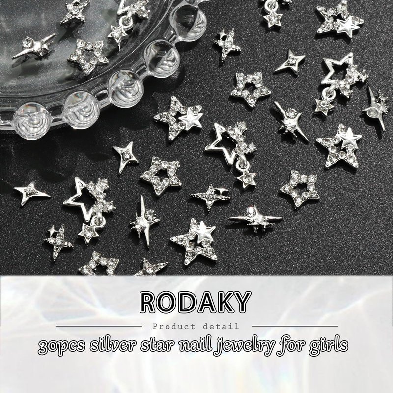 RODAKY 30PCS Silver Star Nail Charms Shiny 3D Stars Nail Gems Starlight Nail Jewelry Y2K Charms for Acrylic Nails Decoration Metal Nail Supplies for Women and Girls