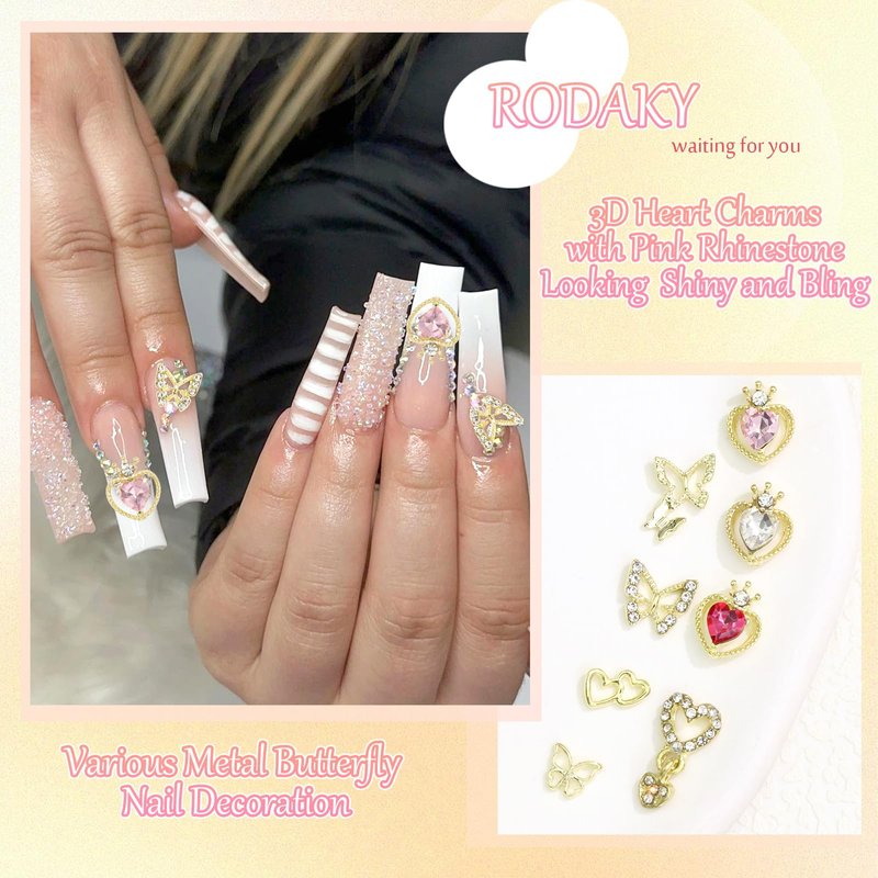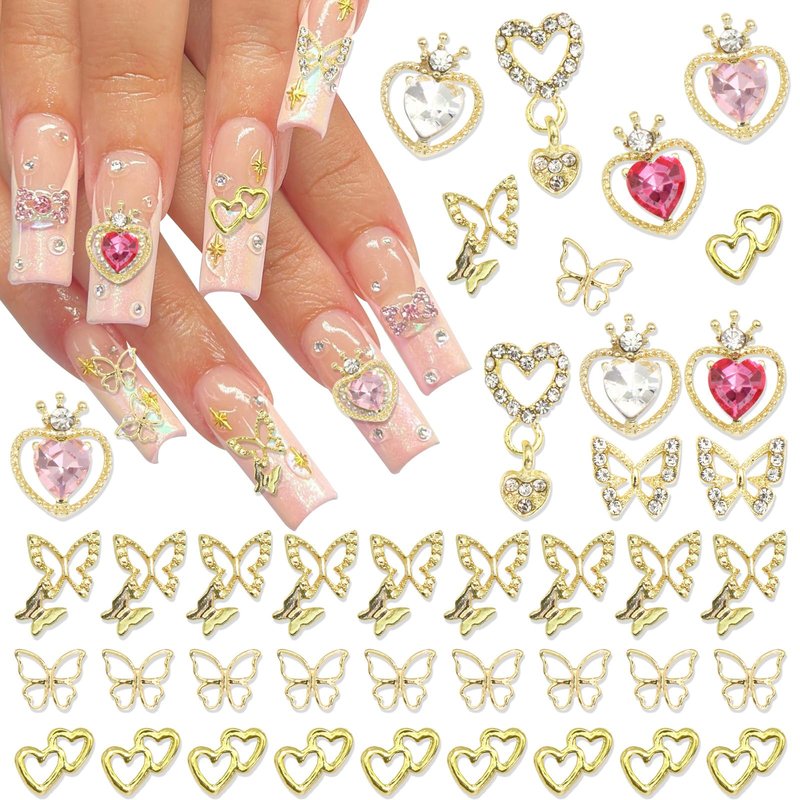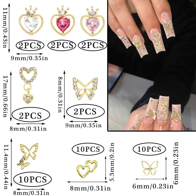 - Exquisite Design:These butterfly,dangle heart nail charms are designed combining gold metal base and clear&pink crystal rhinestones,making these nail decoration shiny and bling.With these luxury charms,you nails art will more charming and attractive.