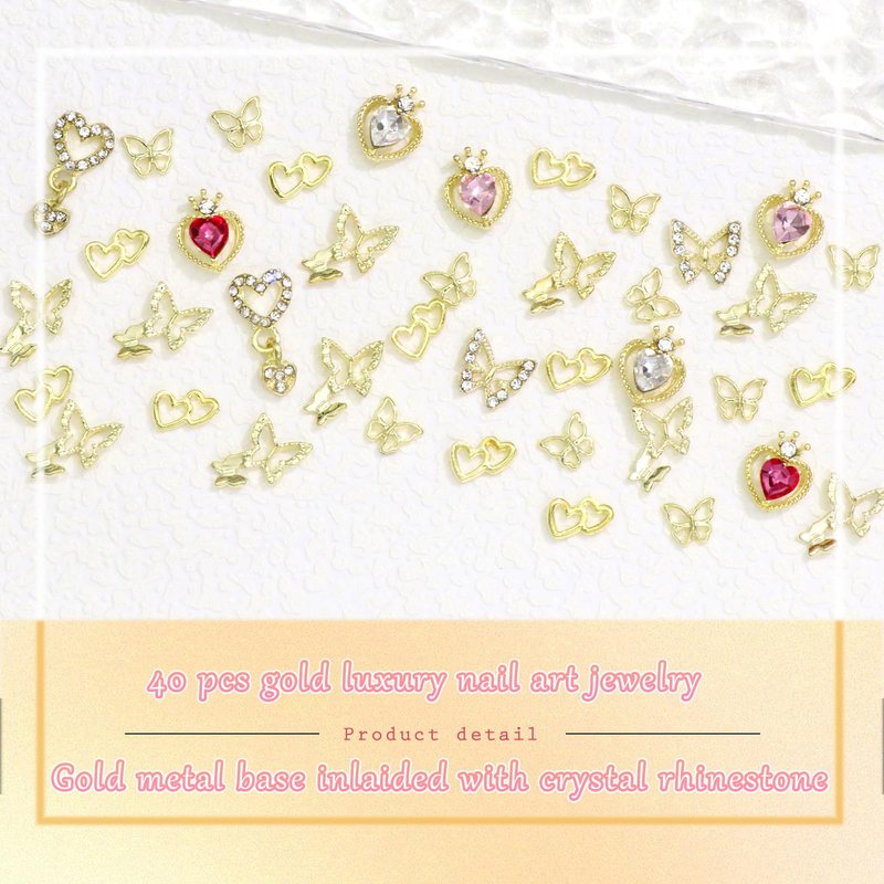 RODAKY 40PCS Butterfly Nail Charms Gold 3D Alloy Butterfly Nail Art Charms Dangle Heart Charms for Nail Multi Style Nail Gems Rhinestone Luxury Nail Decoration for Manicure Design