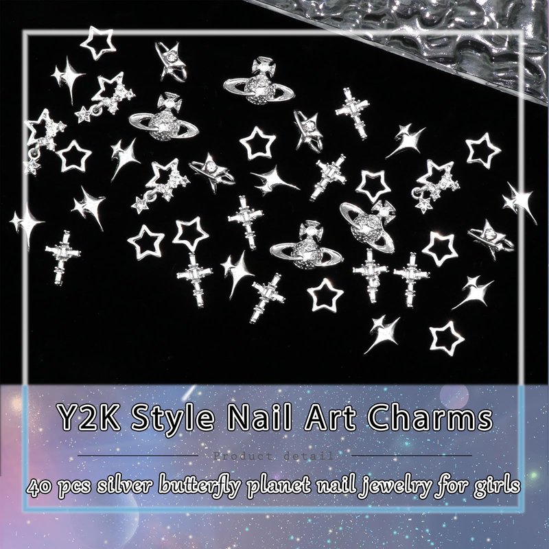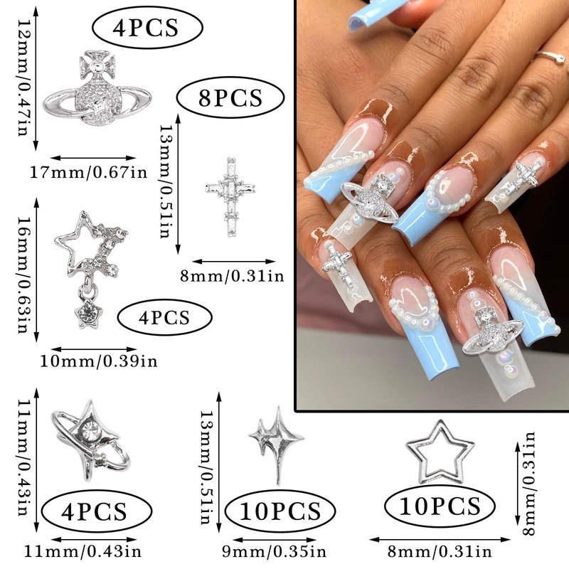 These Y2k style nail decorations in 3D planet,starlight and cross shape will making your nails brighter and unique.