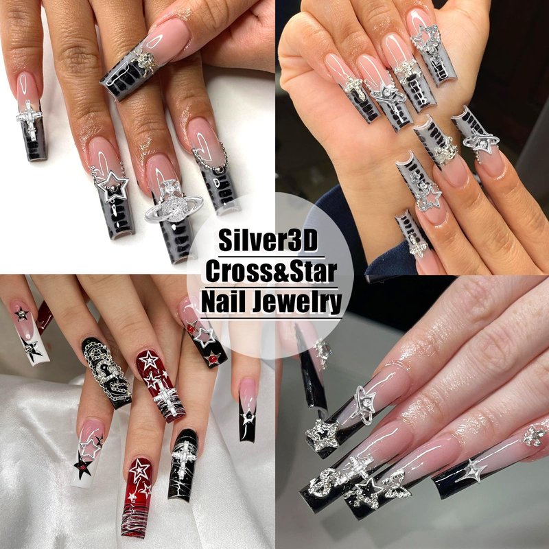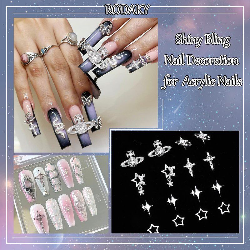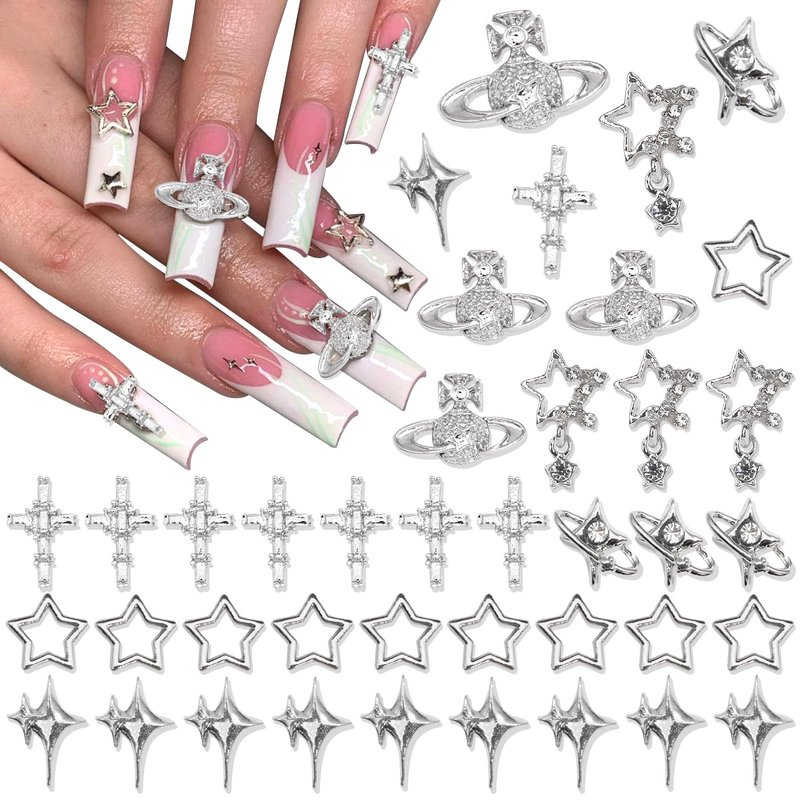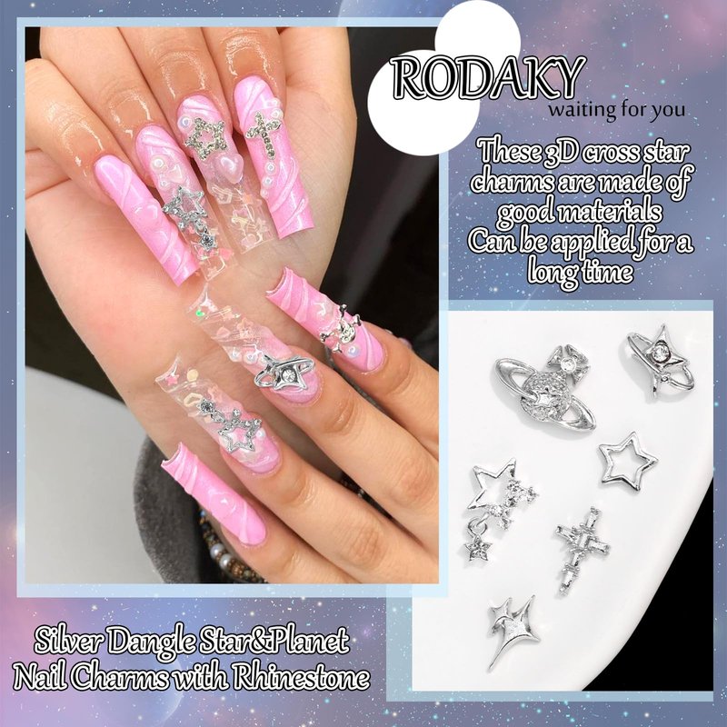 - Excellent Design:3D silver nail art charms in various styles,including planet,cross,dangle star,starlight,hollow star.Silver alloy metal base inlaided with shiny crystal rhinestone,making these nail decoration looked glitter,also add vibrancy and versatility to your manicures.