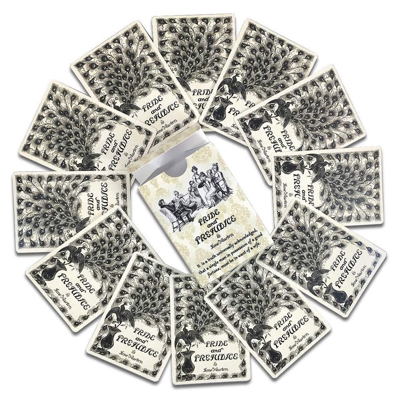 Pride and Prejudice themed poker playing cards! With characters from the classic book by Jane Austen- "Pride and Prejudice" Illustrations by Hugh Thomson - Mr.Darcy, Elizabeth Bennet, Mr&Mrs Bennet, Kitty Bennet, Lydia Bennet. Mr.Wiliam Collins, Charles Bingley, Caroline Bingley and much more! Perfect gift for Pride and Prejudice lovers! 54 poker-size card deck (including 2 jokers) 2.5'' x 3.5'' (63.5mm x 89mm) Printed on 300gsm casino quality cardstock paper with a coated smooth finish. Light Beige Box.