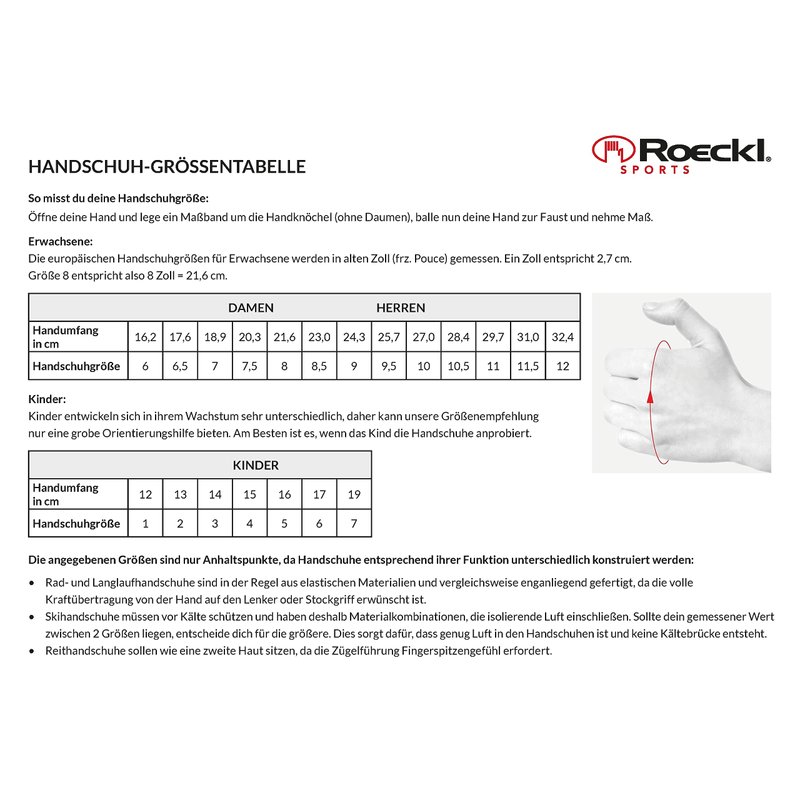 Roeck-Grip is Roeckl's exclusive performance textile, which is supple, flexible, and breathable for maximum tactility and grip on the reins. The Roeck-Grip Glove fits like a second skin, giving the rider a close contact feel. Features: Breathable, elasticated, and supple Touchscreen compatible Superior close contact grip Unisex sizing Easy care: Machine wash Backhand: Roeck-GripPalmhand: Roeck-Grip Often imitated, but never equaled: The ROECK-GRIP developed by ROECKL is the unmistakable original. In fact, its uniqueness is clearly tangible. As is often the case, it is the details and especially the materials that make all the difference. ROECK-GRIP is an exclusive material. It is extremely breathable, elastic and supple. In short: It fits like a second skin. At the same time, it ensures excellent grip and tactility for handling the reins. In order to guarantee the ideal fit, ROECKL uses classical French glove sizes. The Munich-based glove tailors also attach great importance to the manufacturing quality: The individual pieces are meticulously sewn together by hand. Seam tolerances of max. 1 millimeter are merely a tangible quality criterion, because comfort cannot be measured. The secret lies in the cuts and proportions. This is where ROECKL draws on more than 180 years of experience in the art of glove tailoring. The characteristic fastener with the stylized hand logo reliably secures the glove around your wrist. Size Chart
