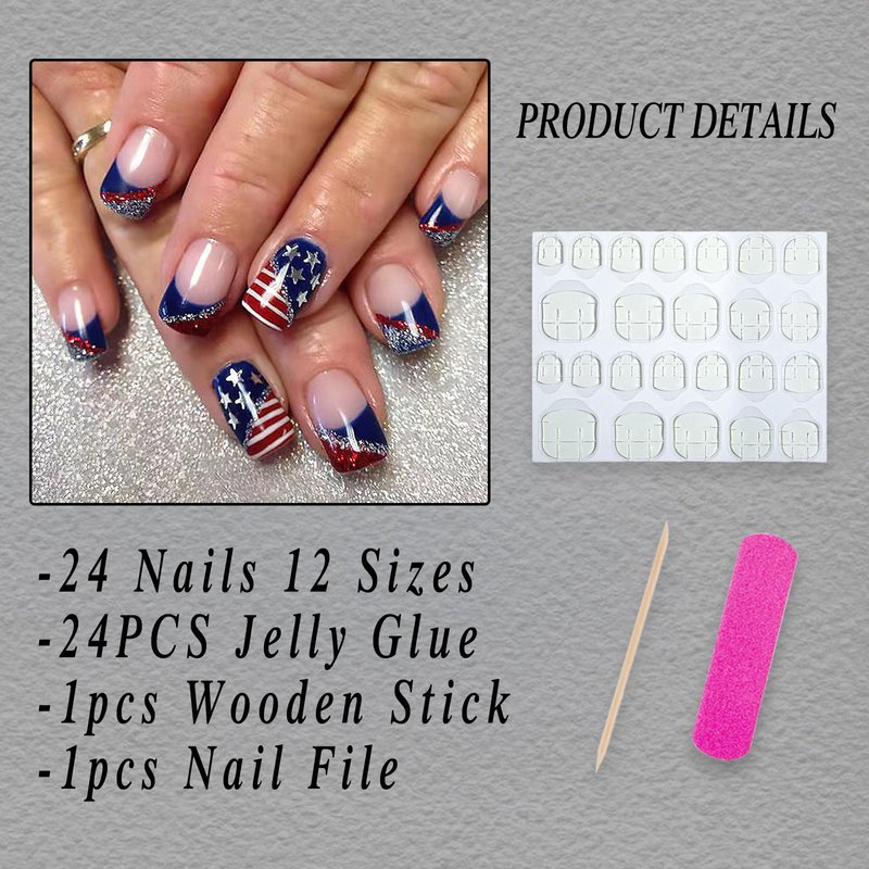- 【Package Included】24pcs glossy red blue flag false nails, jelly glue, a wooden stick. (Jelly glue makes the false nails reusable. Please use suitable glue according to different scenes.)