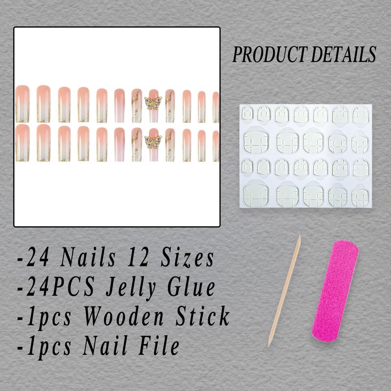 - 【Package Included】24pcs glossy gold foil false nails, jelly glue, a wooden stick. (Jelly glue makes the false nails reusable. Please use suitable glue according to different scenes.)