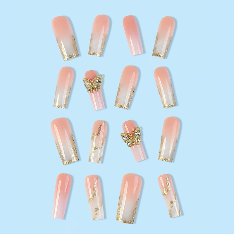 ROFIBUT Gold Glitter Press on Nails Long Square Fake Nails Glossy Ombre Acrylic False Nails with 3D Butterfly Designs Bling Gold Glitter Coffin Glue on Nails Reusable Stick on Nails for Women 24Pcs