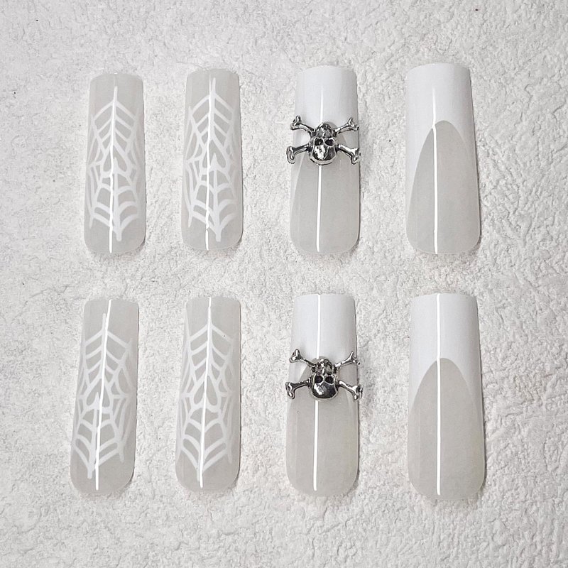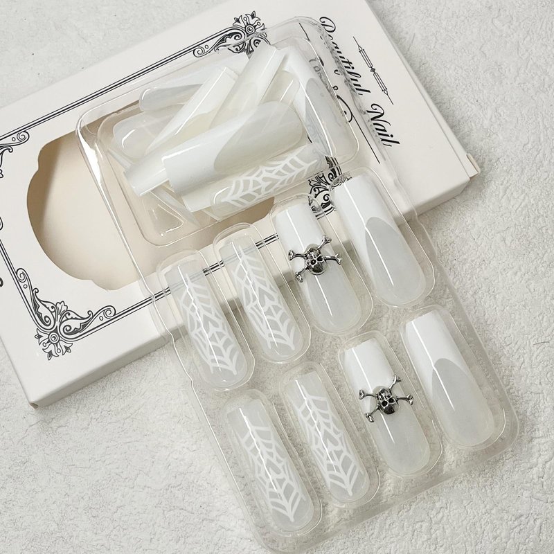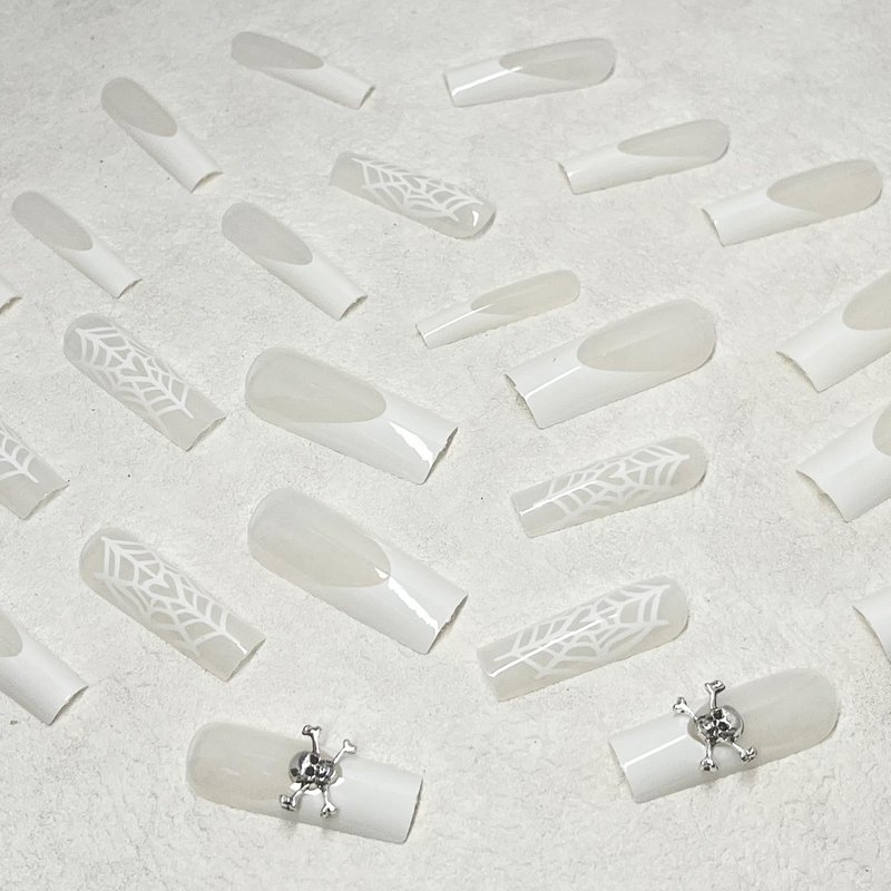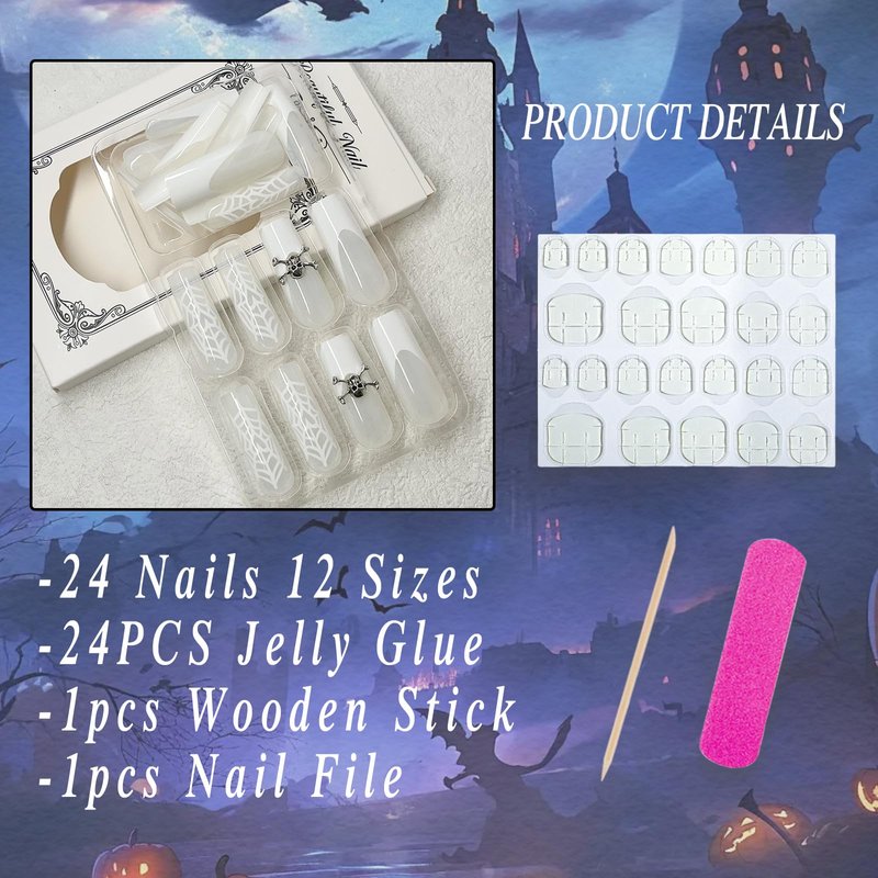 - 【Package Included】24pcs glossy white spider web false nails, jelly glue, a wooden stick. (Jelly glue makes the false nails reusable. Please use suitable glue according to different scenes.)