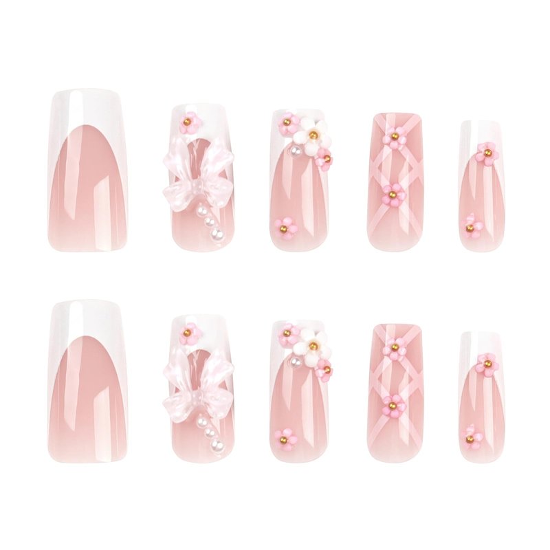 ROFIBUT Pink Press on Nails Medium Long Coffin Square Fake Nails Glossy White French Tip Glue on Nails with 3D Pink Flower Bow Charms Cute Ballet Full Cover False Nails for Women Girls Manicure 24Pcs
