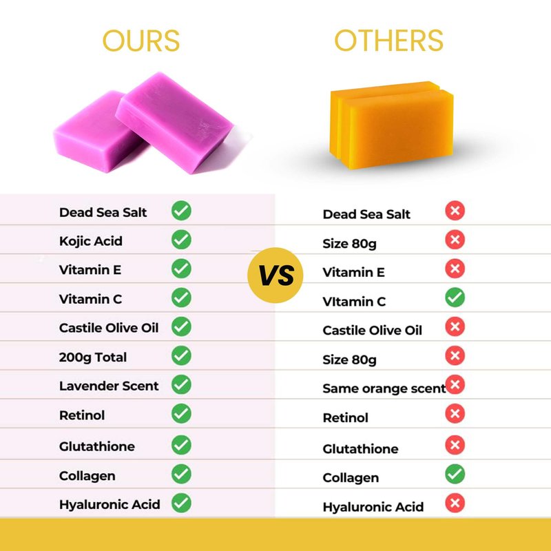 - HEALS & CLEANSES YOUR SKIN: Formulated with a potent blend of Dead Sea salt, kojic acid, vitamin C, vitamin E, castor oil, retinol, and collagen, our soap heals and cleanses your skin, effectively reducing the appearance of dark spots, hyperpigmentation, and uneven skin tone.