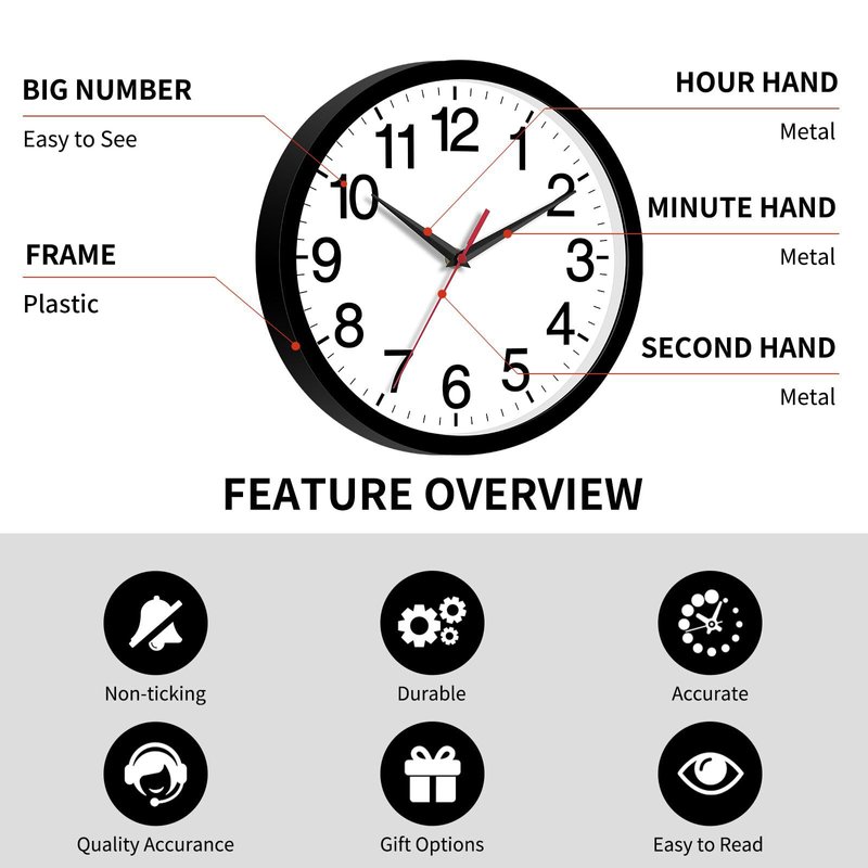 ► Features: Simple and modern style, equipped with Big Numbers, Silent non-ticking sweep movement, Environmental-Friendly Material