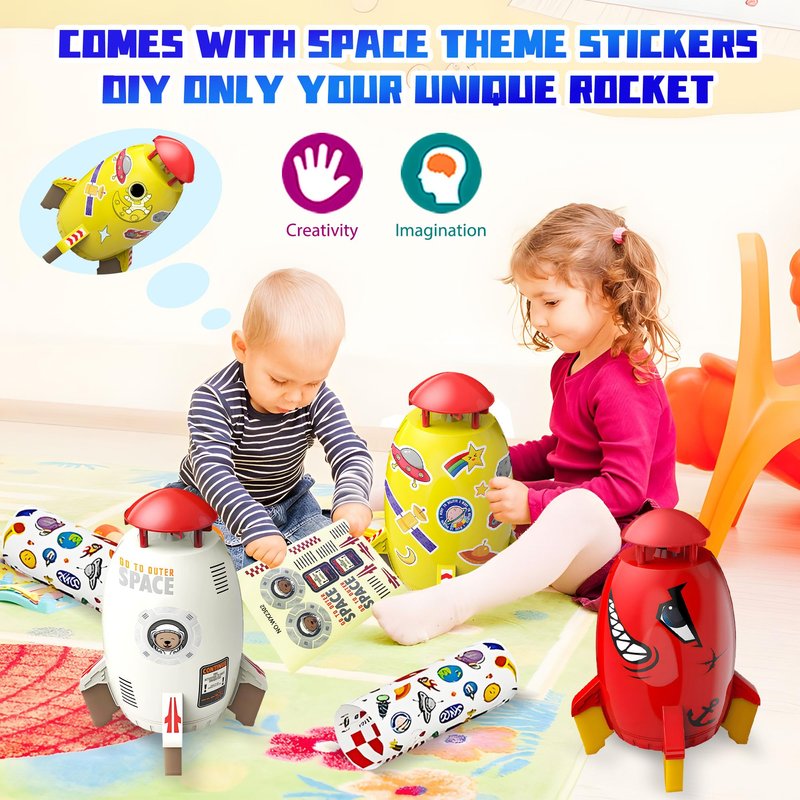 The water toys for kids ages 3-5 to ignite your child's imagination and curiosity! This exciting and interactive STEM toy is designed to inspire a love for science, technology, engineering, and mathematics in young minds. With our water toys for kids ages 4-8, kids can embark on a thrilling journey of exploration as they dive into the principles of rocketry, water pressure, and mechanics. By attaching the garden hose to the sprinkler base, they can witness the incredible jet of water propelling the rocket's cockpit upwards, eventually rotating a full 360 degrees to spray water all around. It's like experiencing a real rocket launch right in your backyard! Not only does the Water rocket launcher for kids provide endless fun and excitement, but it also offers valuable learning opportunities. Kids will be fascinated by the concept of rocket propulsion and will gain a hands-on understanding of physics as they observe the rocket's height, which can reach up to an impressive 5-6 feet depending on water pressure. This engaging playtime experience will encourage their interest in STEM subjects and foster their problem-solving skills. To add a personal touch, our Water sprinklers for yard kids comes with DIY stickers. Kids can unleash their creativity and decorate the rocket water toy according to their preferences, making it a unique and beautiful creation that stands out from the rest. This customization aspect allows them to express their artistic abilities and boosts their self-confidence. Safety is our top priority, which is why the kid sprinklers for backyard are crafted using eco-friendly ABS material that is safe, sturdy, and durable. It ensures hours of fun under the sun for your kids and even your furry friends. Plus, the kids water sprinklers for outside design is both visually captivating and child-friendly, making it a hit at any backyard party or summer gathering.