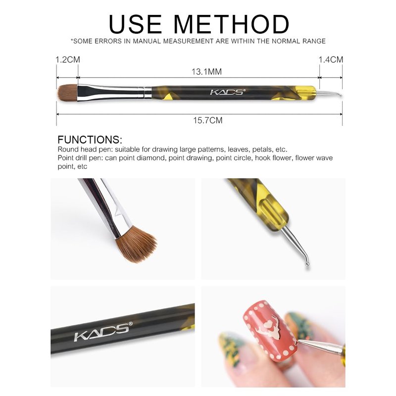- THOUGHTFUL DESIGN:2 way nail tool,use for nail brush and nail dotting pen,convenient and makes the manicure more efficient and faster.