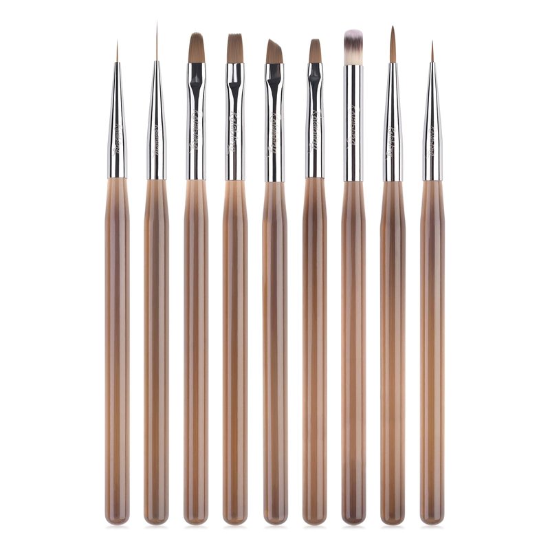 The set includes nine different brushes, including long striping brush, short striping brush, flat brush, round brush, rounded angled brush, and basic brush, catering to all your needs in nail art design. It is not only suitable for beginners in nail art but also highly recommended for professional nail studios.
