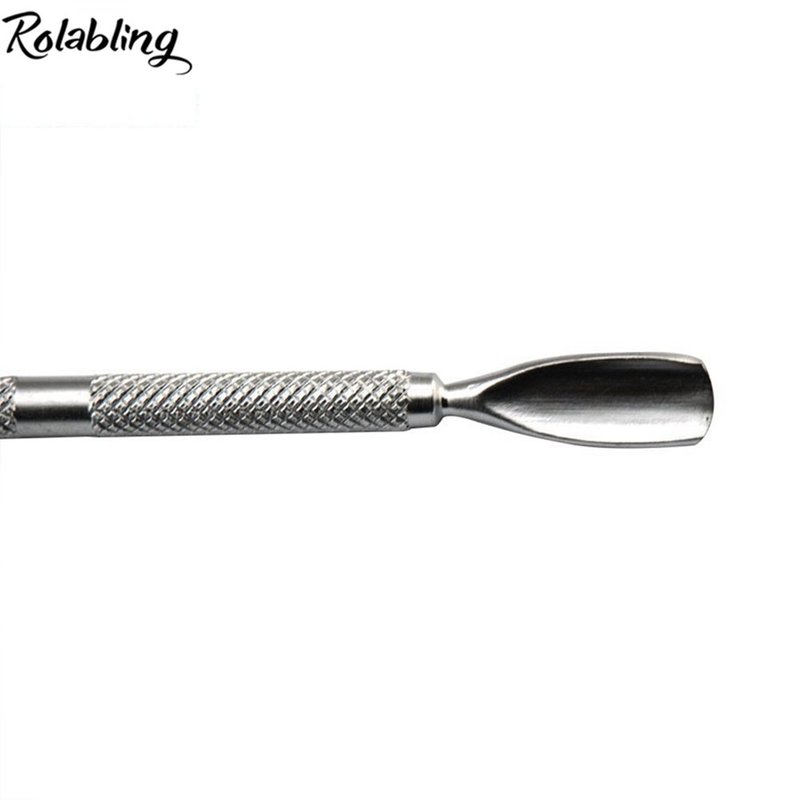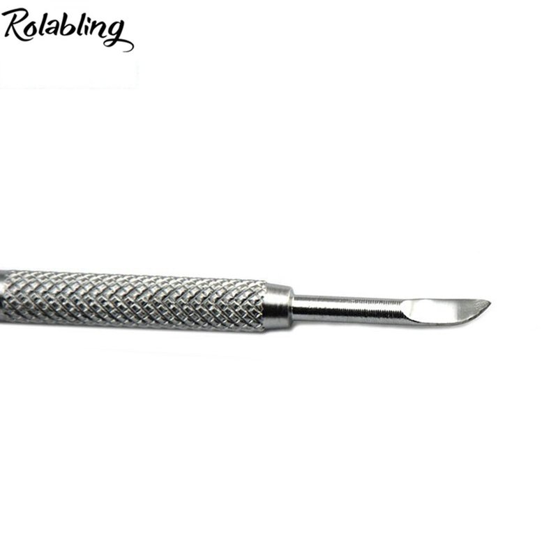 - Both ends have different shapes, applied for different functions, The spoon-like end (curved-end) is used for pushing cuticles, the blade scrapes the hard-to-remove leftover skin residue on the nail.