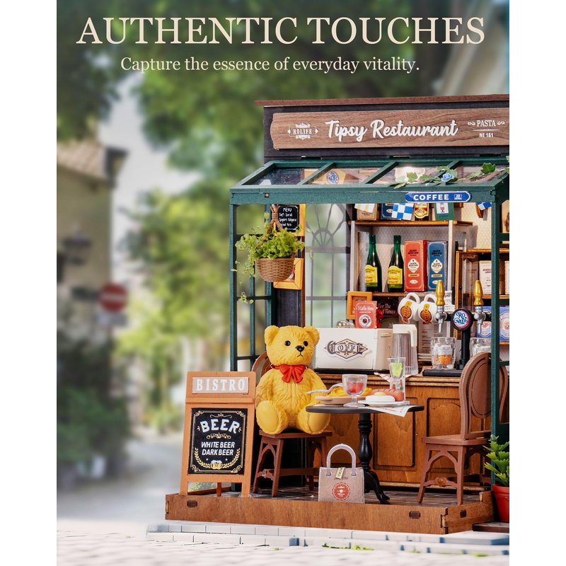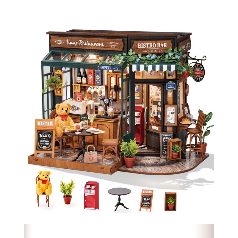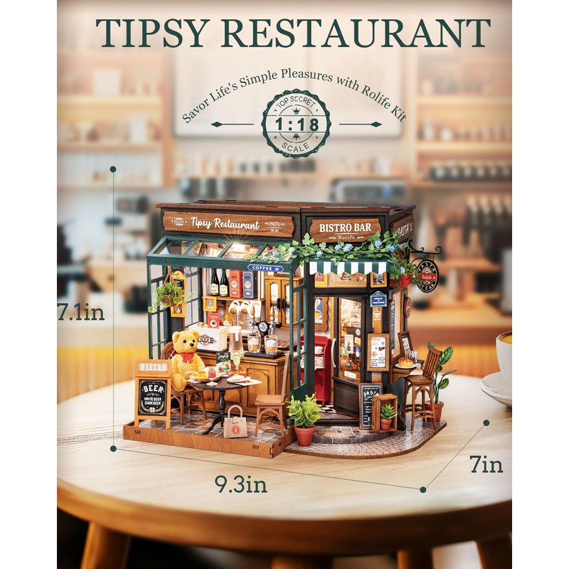 Rolife Tipsy Restaurant is a 1:18 scale miniature house model kit. The mini house alllows you handcraft a charming café scene that captures the essence of joy and vitality. With LED and exquisite details, it will be both a delight on sehlf, and a good fitting to your lovely mini figures.