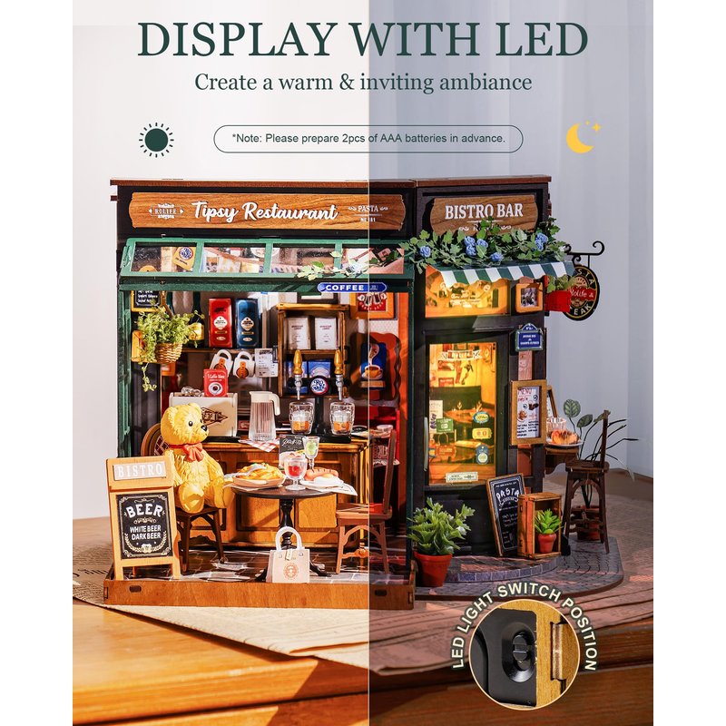 - 【Enchanting Details】The miniature kit includes lifelike accessories and scenes that make you feel like you're in a real café: Rack full of cups and bottles, colorful flags, dining table, etc. The LED light brings add a cozy ambiance to your miniature world. Just please prepare 2 pieces of AAA batteries in advance (not included).
