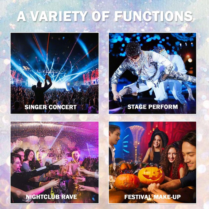 - Widely Applicable---This ultra-fine mermaid body glitter can be used on eyes, eyebrows, cheeks, face, hair and collarbones and any other areas you want to apply. Especially suitable for birthday parties, singer idol concerts, stages, bars, concerts, Halloween and other carnivals. Give your friends and family bold and fun makeup ideas and let your glittery makeup shine brightly under the lights.