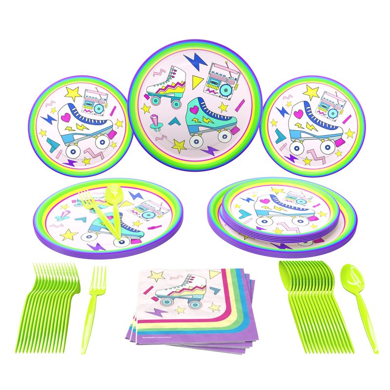 - [EVERYTHING YOU NEED] Each colorful Roller Skating Party Kit includes 16 9-inch paper dinner plates, 16 7-inch paper dessert plates, 20 paper lunch napkins, 24 lime plastic forks, and 24 lime plastic spoons.