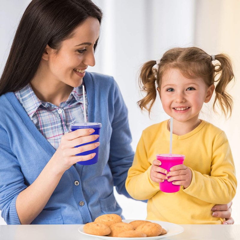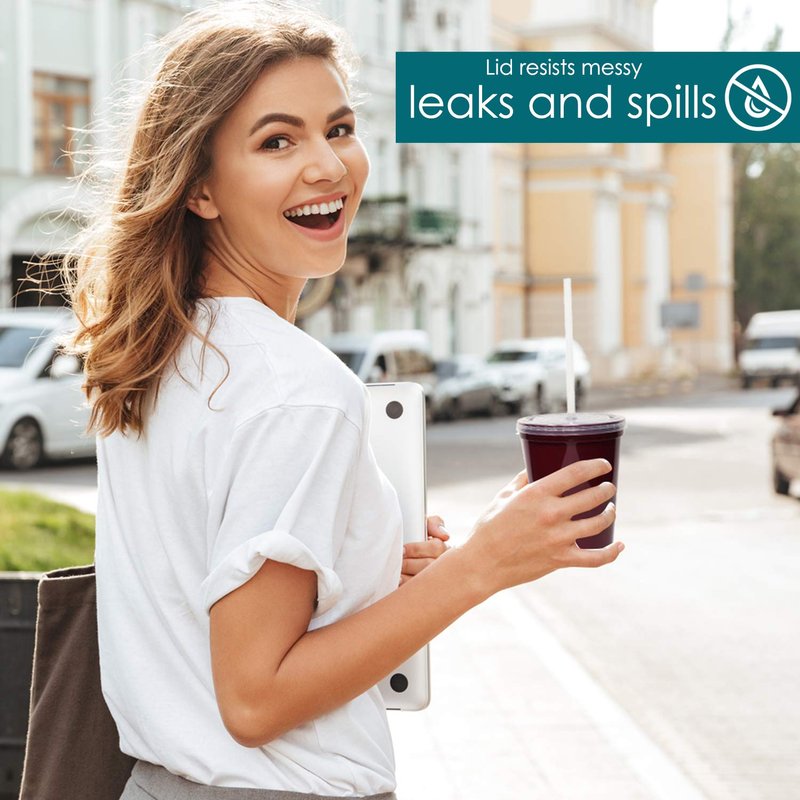 - VALUE PACK : Set includes 6 reusable 16oz plastic drink cups with clear snap-on lids; 6 reusable clear plastic straws; Cup colors: Red, Orange, Yellow, Green, Blue, Purple
