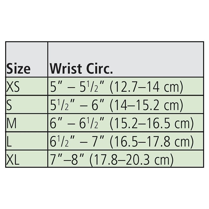 - Thumb support is fitted for the right thumb and a size of x-small with a wrist circumference of 5" – 5-1/2" (12.7–14 cm)