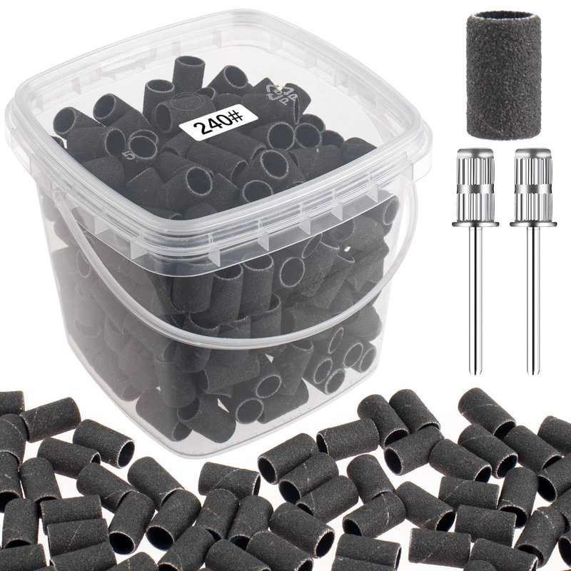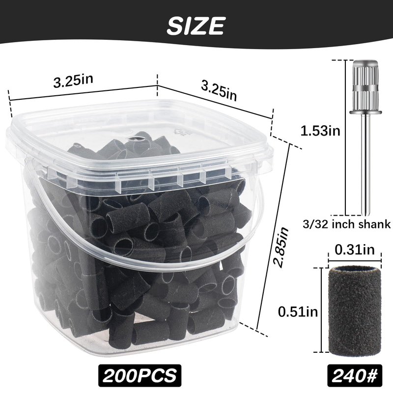 - 240 grit fine sanding bands: You will receive 200 pieces black nail sanding bands, 2 pieces 3/32 inch silver replacement mandrel nail drill bits in 1 cute little bucket, 240 girt extreme fine sanding bands is perfect for nail polish and polishing tools, suitable for professional studio or home use, perfect for manicures and pedicures
