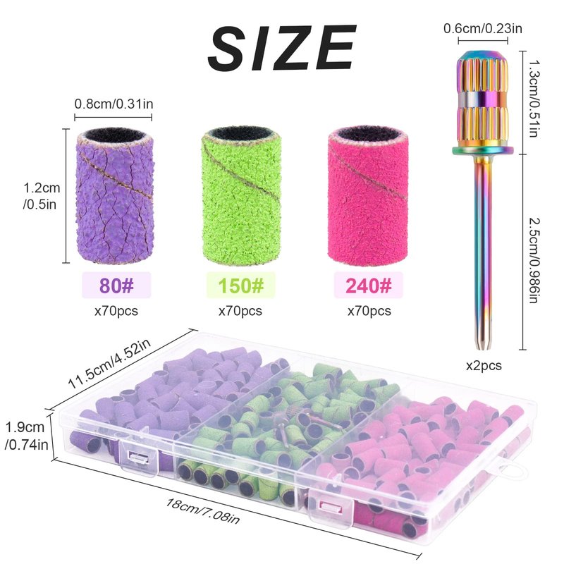 - Sufficient Quantity: 80# coarse grit in purple 70pcs, 150# medium grit in fluorescent green 70pcs, 240# fine grit in pink 70pcs, come with 2pcs 3/32 inch colorful nail drill bits, suitable for most size electric nail drill,3 different colors to make you excited and have a beautiful mood during manicure and 3 different grits to meet your different needs of manicure