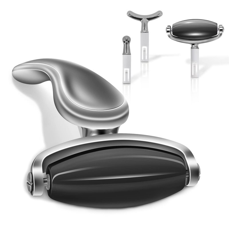ROMALOVE Jade Facial Roller, Jade Face Roller Massager with 3 Interchangeable Heads for Women Routine Skin Care, Reduce Puffiness Wrinkling Rejuvenate Skin (Black Roller + Silver Black)