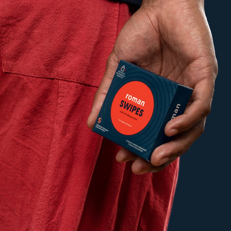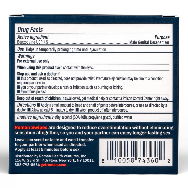 This item is electronically protected. Exclusive savings inside. With 4% Benzocaine. For longer-lasting sex. 5 individually packaged. Clinically proven ingredient to delay ejaculation. Roman Swipes are designed to reduce overstimulation without eliminating sensation altogether, so you and your partner can enjoy longer-lasting sex. getroman.com.