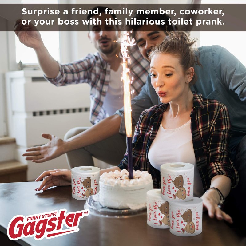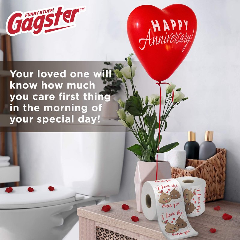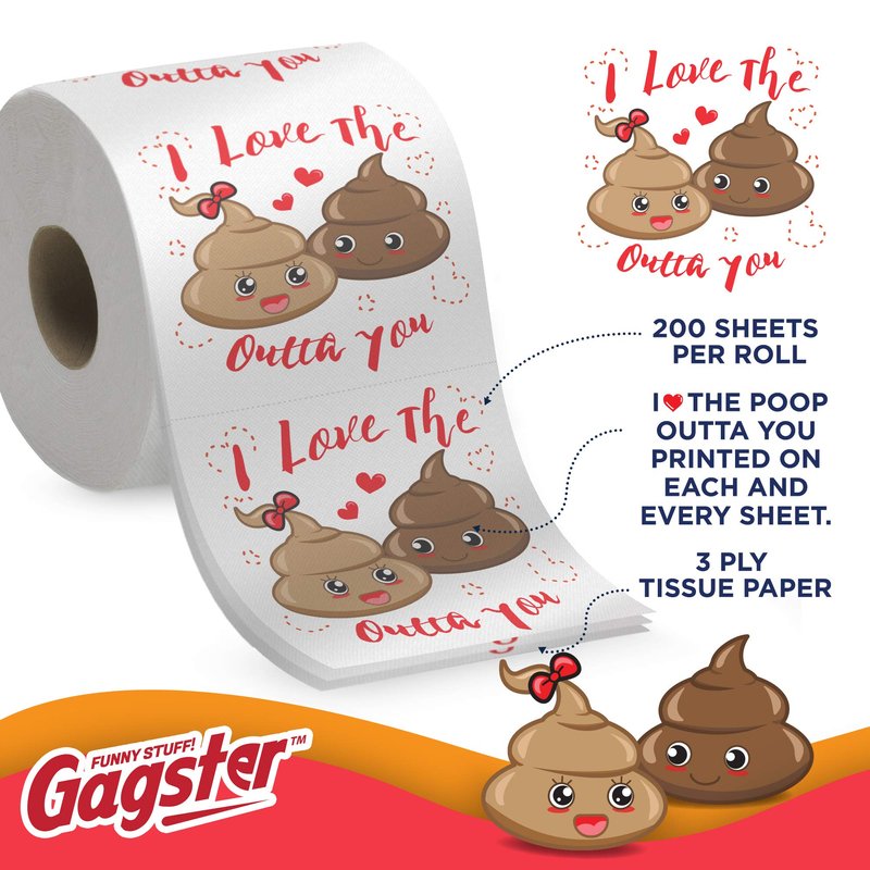 - EXPRESS YOUR LOVE WITH HUMOR: The Romantic Toilet Paper Roll by Gagster is the perfect way to add some laughter to your special occasions. Each sheet features a funny and romantic message: "I Love the Poop Outta You." Surprise your loved one with this hilarious and unique gag gift.