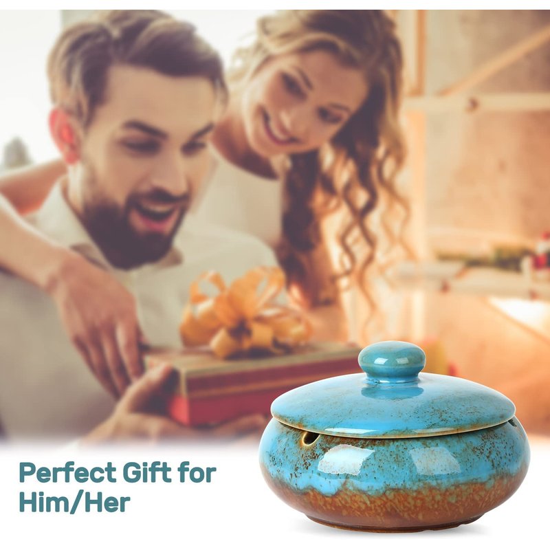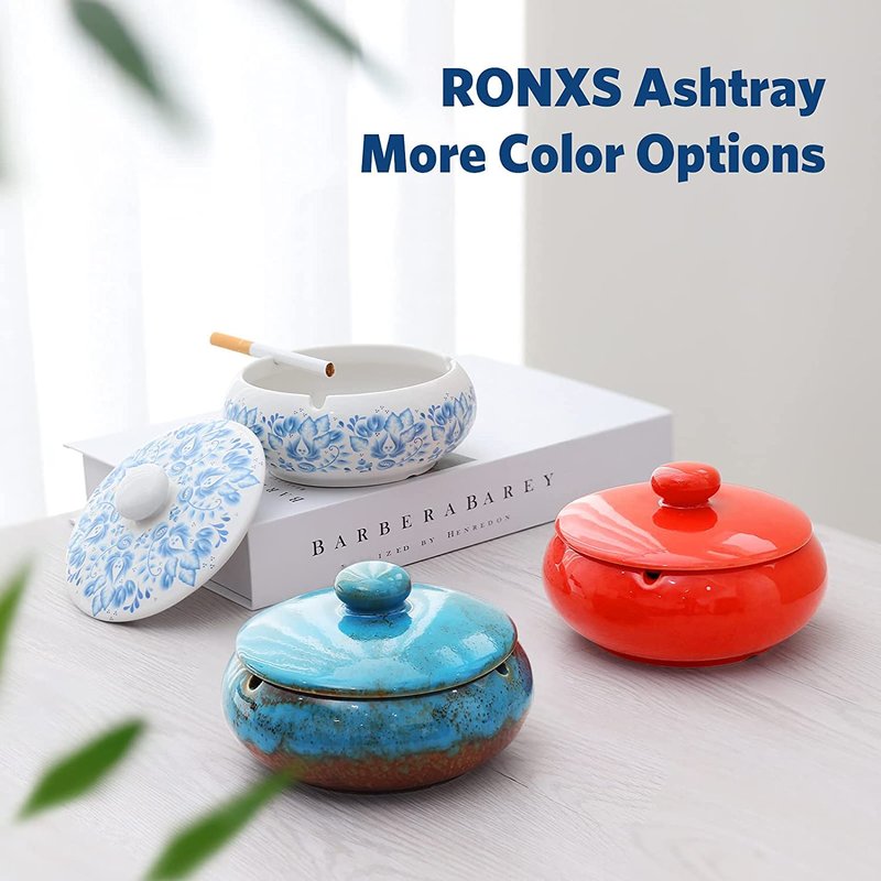 RONXS Ashtray, Outdoor Ash tray for Patio with Lid, Windproof Ashtrays for Cigarettes, Handmade Ceramic Ashtray for Home Office Indoor Decoration