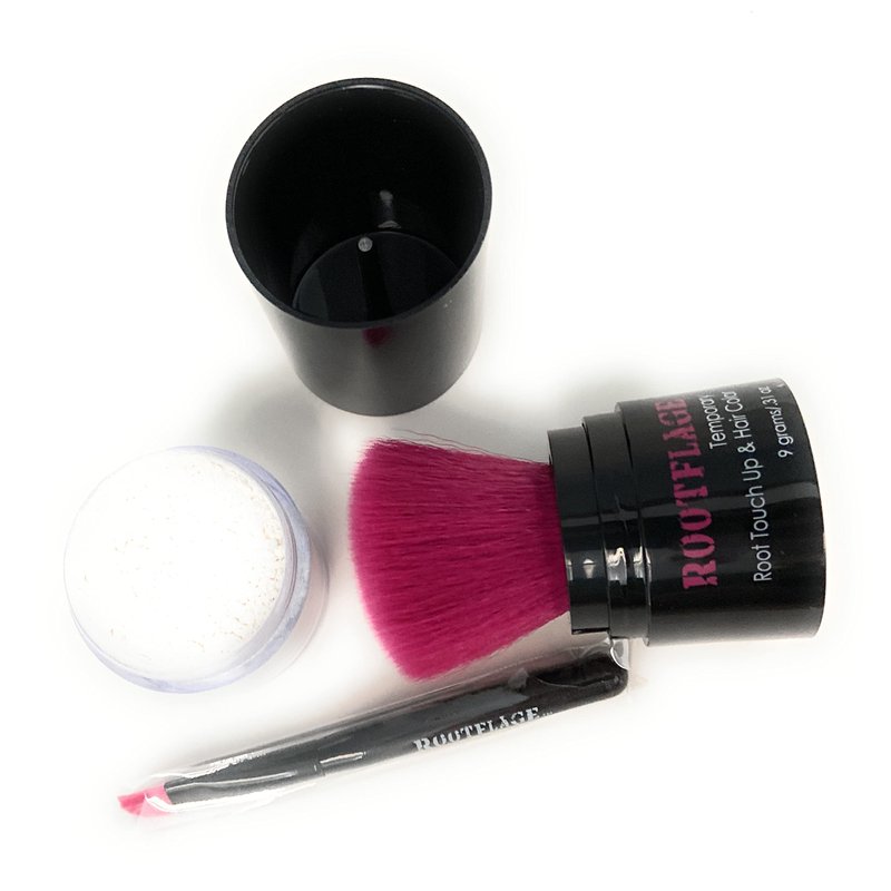 Rootflage Just Shimmer Temporary Hair Color Powder for Shimmering Platinum White Frosty Blonde Highlights. Looking for some temporary shimmer in your life? Just Shimmer highlight powder is a fabulous way to instantly add a hint of luminous icy white frosty highlight shimmer to your hair, face and body without and damage. Just brush it on and glow! Rootflage Just Shimmer is a 3-in-one product. Hair shimmer Face shimmer Body shimmer Everybody stop, shimmer time!