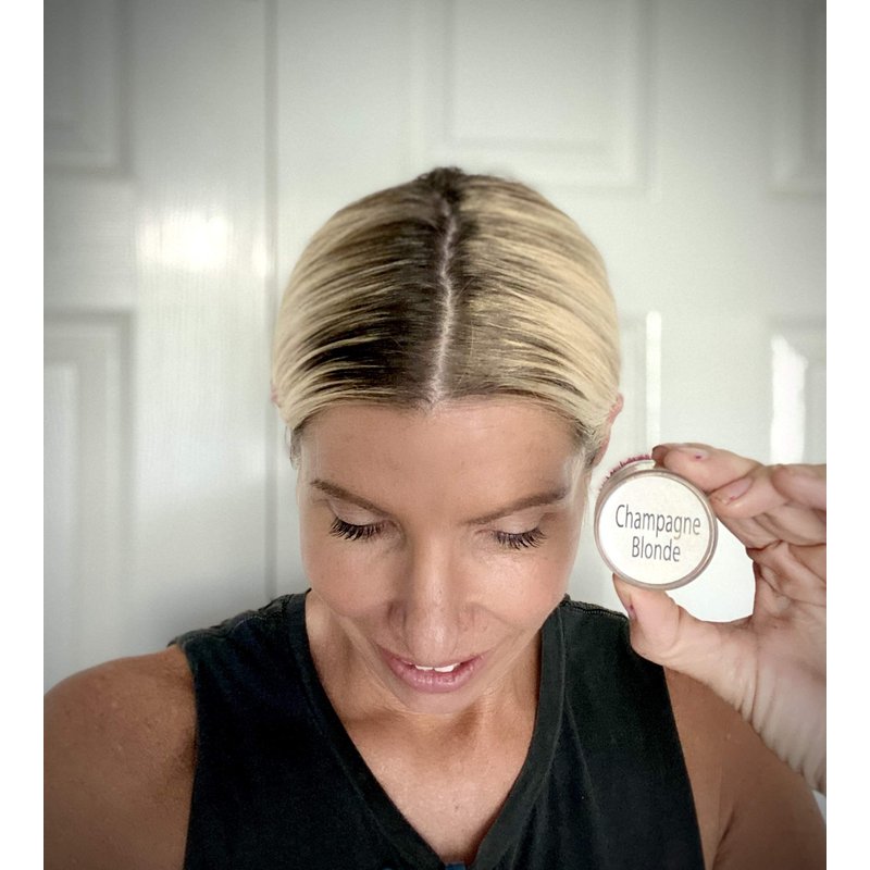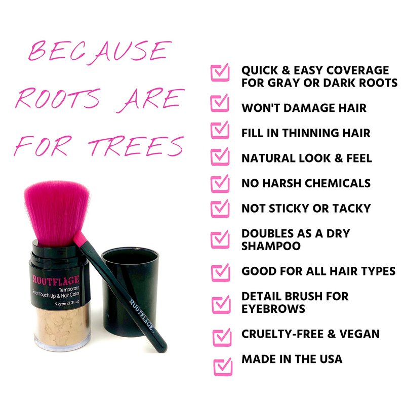 Rootflage CHAMPAGNE BLONDE will quickly add a shimmery blonde highlights to dark or blonde hair. Add a gorgeous highlight in seconds without damaging your hair. No bleaching necessary. TEMPORARY HAIR COLOR-Gray hair cover up, dark or light roots. Saves time and money between salon visits. Helps extend time between salon appointments. Helps extend time between shampoos. DOUBLES AS A DRY SHAMPOO COMES WITH LARGE KABUKI BRUSH AND SMALL DETAIL BRUSH FOR VERSATILE APPLICATION 25 + LUMINOUS COLORS TO CHOOSE FROM EASY TO APPLY COLOR TOUCH UP -Simple to use. Fast and foolproof 30 second application INSTANT BLONDE WITH NO DYES, Adheres to hair until you shampoo it out. NO HARSH CHEMICALS, WON'T DAMAGE HAIR leaves it feeling soft. CREATE HIGHLIGHTS OR LOW LIGHTS FREE COLOR CONSULTATION if you don't know what color is right for you. EXTEND YOUR HAIR APPOINTMENT FOR WEEKS and save money PORTABLE Convenient for travel or when you can't get to the salon. 9 GRAMS =60 APPLICATIONS one bottle can last for months Made in the USA Cruelty Free Rootflage CHAMPAGNE BLONDE is best for anyone with dark hair who wants beige blonde or champagne toned shimmery blonde highlights. Don't know which color of Rootflage is right for your hair? You can email a photo of your hair and we can help you find the right color.