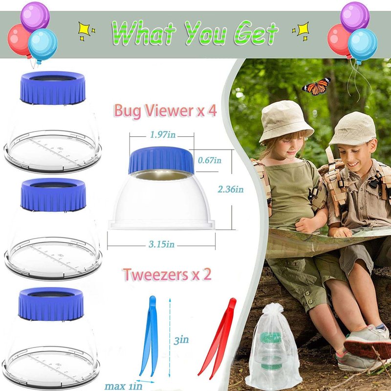 - The package comes with 4 magnifying bug viewers and 2 plastic tweezers(one red another is blue).The size of bug viewer bottle is 3.15in(bottom L) 1.97in( top L) 2.36in (bottle H).The size of tweezers is 2.95in (L) 0.2in (w) 0.7in (open w).All products made of BPA-free and Phthalate-free plastic