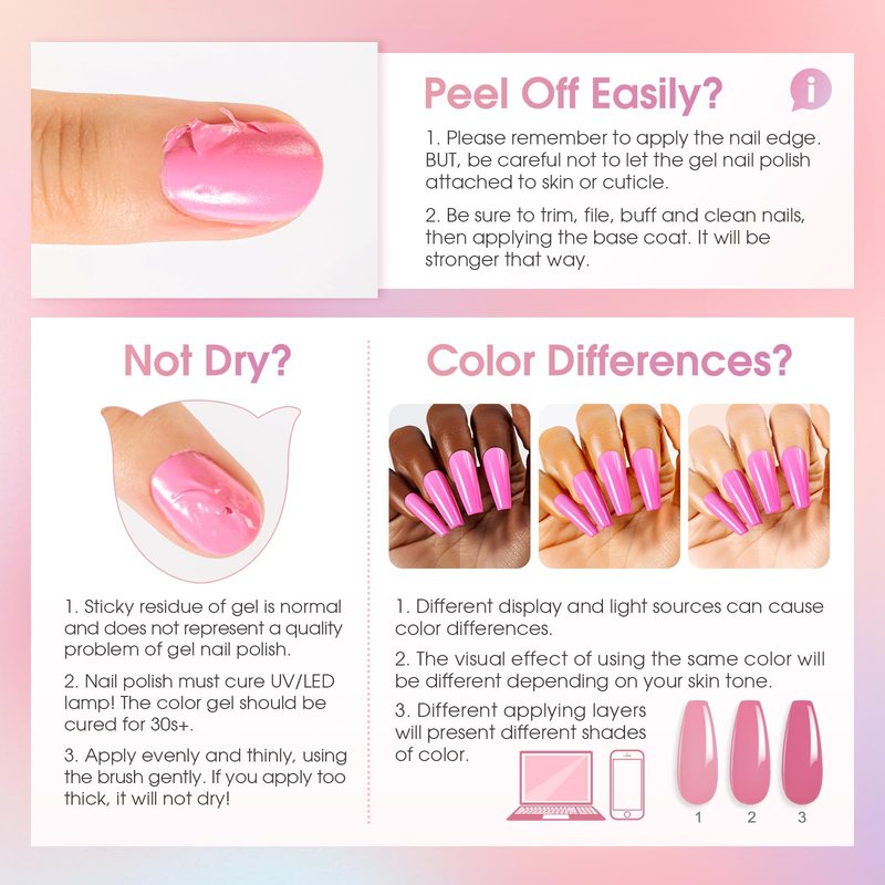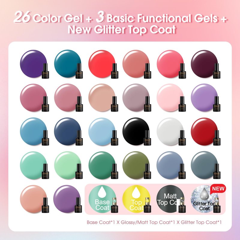 - Colorful Gel:We put together the top 26 trendiest new colors gel polish nail for the year of 2024, so you could display a colorful, stylish, modern manicure every time for holidays! In addition, this nail polish gel set includes not only the regular base coat and glossy matte top coat, but also a new glitter top coat that gives a glitter effect to any color of your choice