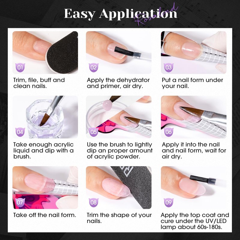 - Easy Application: First, please dip the optimal amount of acrylic liquid with a nail brush. Second, dip the acrylic nail powder with the nail brush. Third, put a nail form on your nail. Fourth, apply it to the nail and wait for 5min by air drying. Finally, use a nail file to trim your acrylic nail into preferred shape, and use a wooden cuticle pusher for DIY carving.Stay at home, easily realize the freedom of acrylic manicure!
