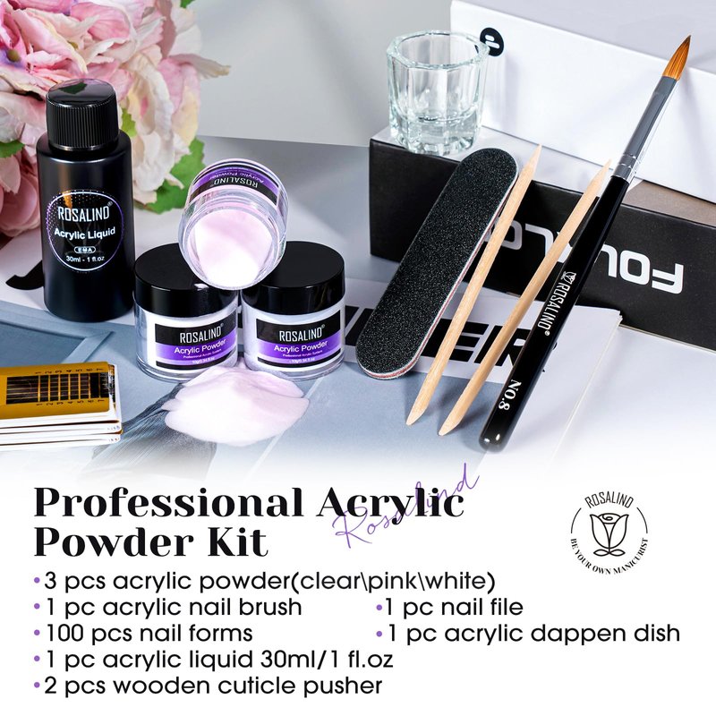 - Acrylic Nail Powder Kit: ROSALIND acrylic nail kit contains clear white pink acrylic powder each 0.34oz/10g,1pcs 30ml/1fl.oz acrylic liquid,1 pcs acrylic nail brush, 100 pcs nail forms,2 pcs wooden cuticle pusher, 1 pcs nail file and 1 pcs acrylic dappen dish. ROSALIND clear acrylic nail powder kit is perfect as base nails, which extend your natural nails, and also for nail carving, sculpting nails, French nails, 3D nail design decoration, etc.