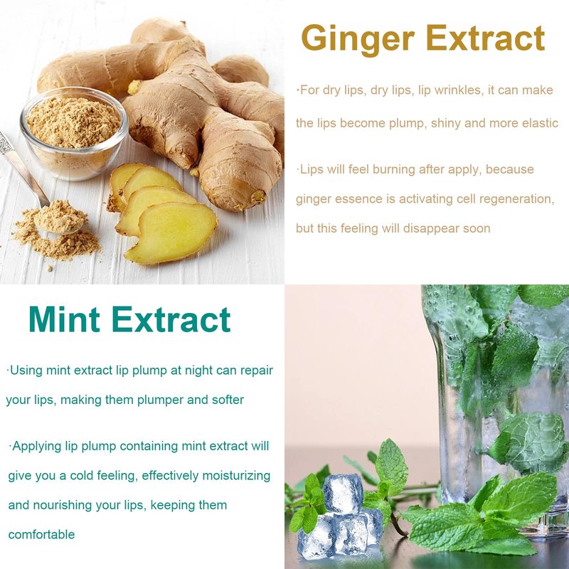 This lip plumper set with ginger lip pumper and peppermint lips pumper, lip plumping gloss gives your lips a temporary burning sensation that will soon disappear, making your lips instantly plump and bigger, mint lip plumping gloss quick can be used as a sleeping lip mask, it will make your lips smoother and softer.