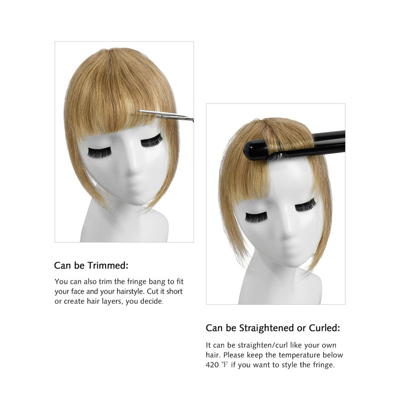 - 100% REMY HUMAN HAIR BANGS - 100% real human hair bangs, selected from healthy and young girl hair, naturally silky appearance and soft touch, no-tangle, no-shedding. It just like your own hair, can be curled or straightened freely by thermal tools and dyed.