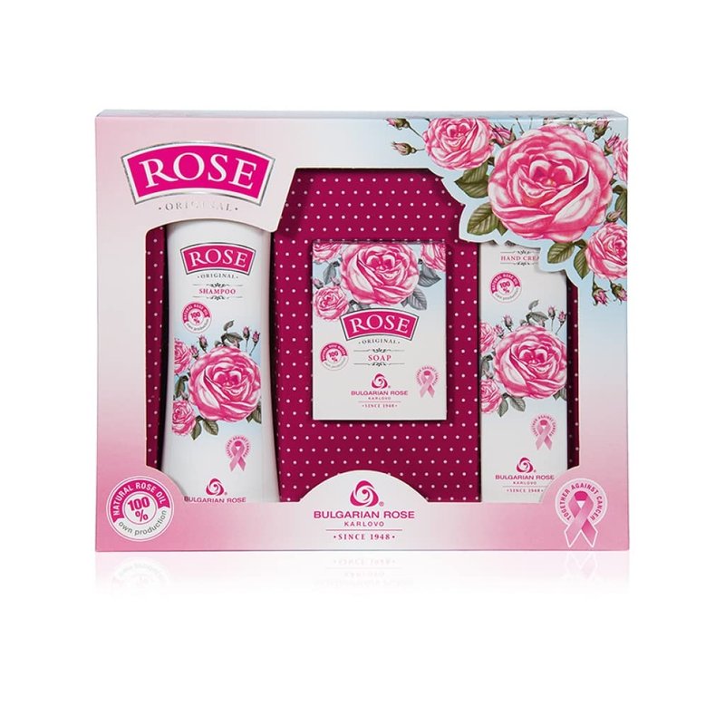 Bulgarian Rose Gift Set including 3 products with Natural Rose Oil. Includes Rose Hand Cream, Rose Bar Soap, Rose Body Wash. This specially-selected gift set with 3 modules offers products for comprehensive hair and skin care. Ideal gift set for you or for your loved one. Suitable for all types of skin and all ages. - Hair Shampoo with natural Bulgarian rose oil (200 ml) - Softening hand cream with vitamin F and natural Bulgarian rose oil (50 ml) - Moisturizing cream-soap for face and body with natural Bulgarian rose oil (100 gr)