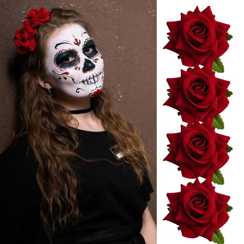 Rose Floral Pin up for Halloween Costume Decoration, Mexican Fabric Rose Flowers Brooch Hair Clip Headpieces for Woman Girl Day of the Dead Hair Decor Halloween Party Costume Decoration(4 Pcs)