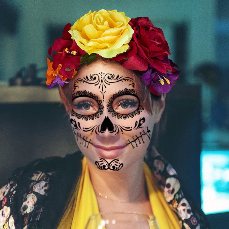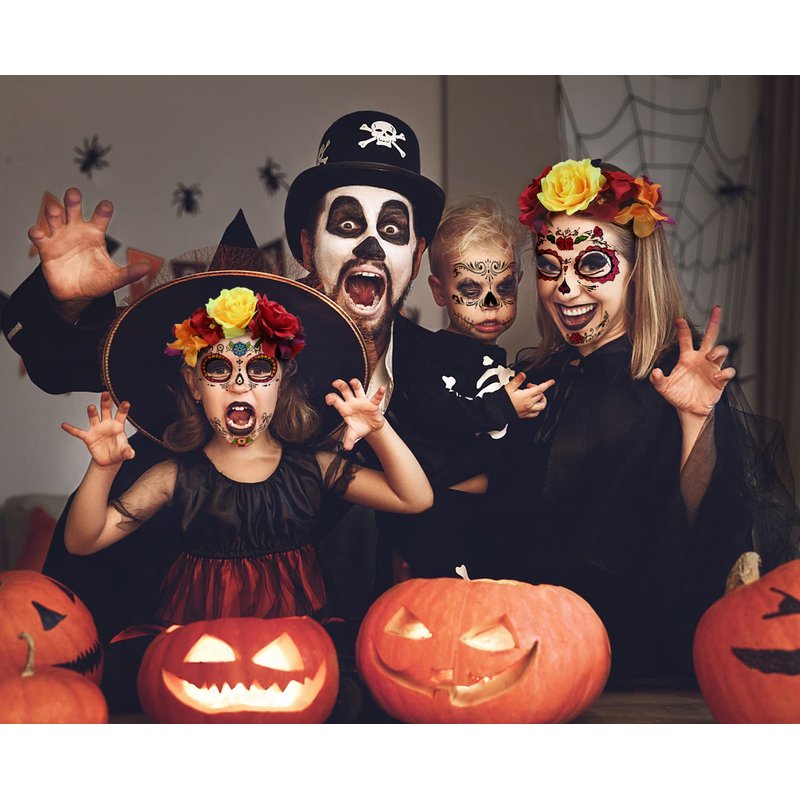 - Package Include : 4 packs Day of the Dead face tattoos stickers and a Halloween headband, the size of the Halloween face tattoo stickers is 6.2" *6.2" and each flower on flower headband is about 1.5 to 2.5 inches, which looks like real flowers